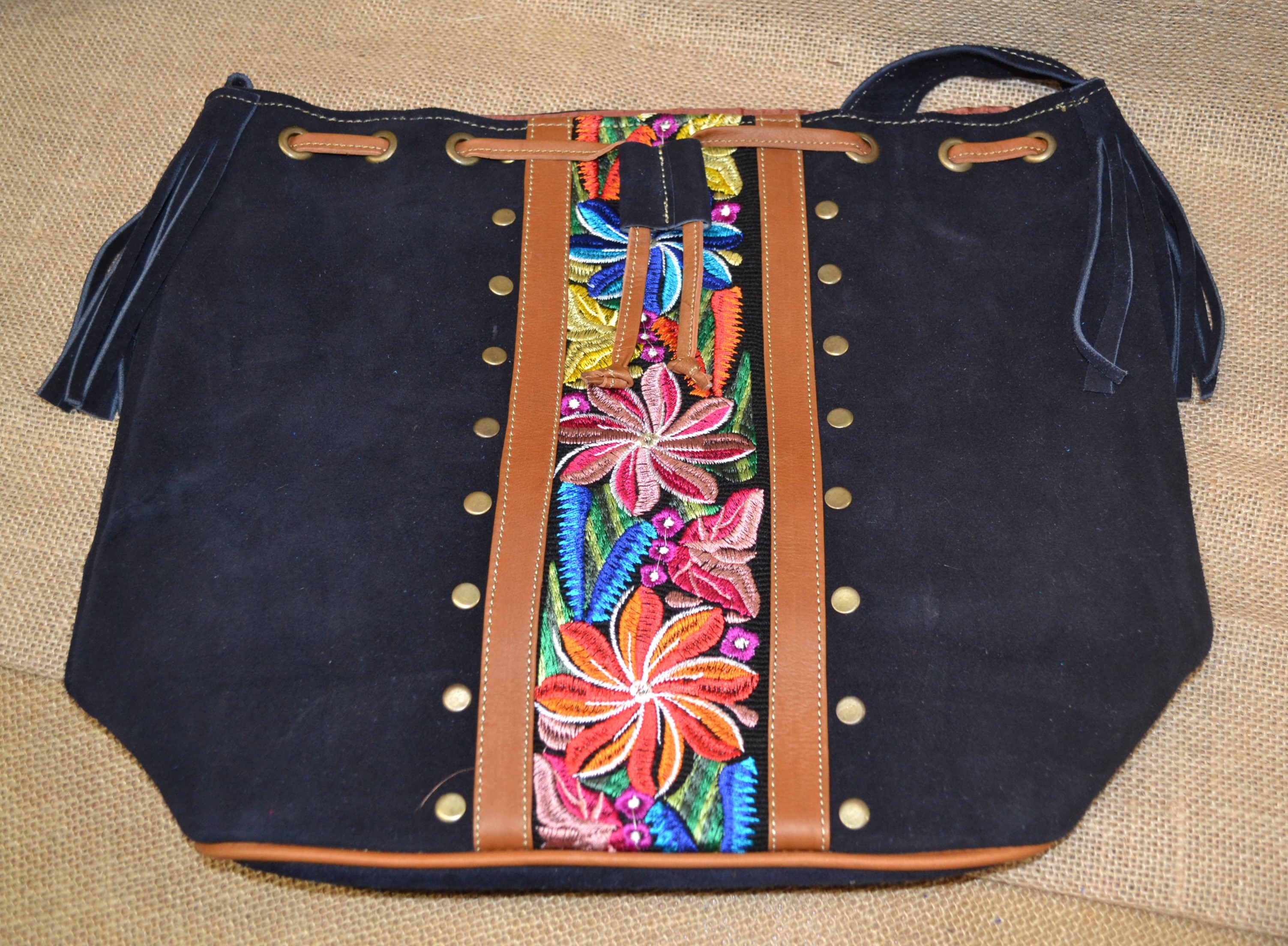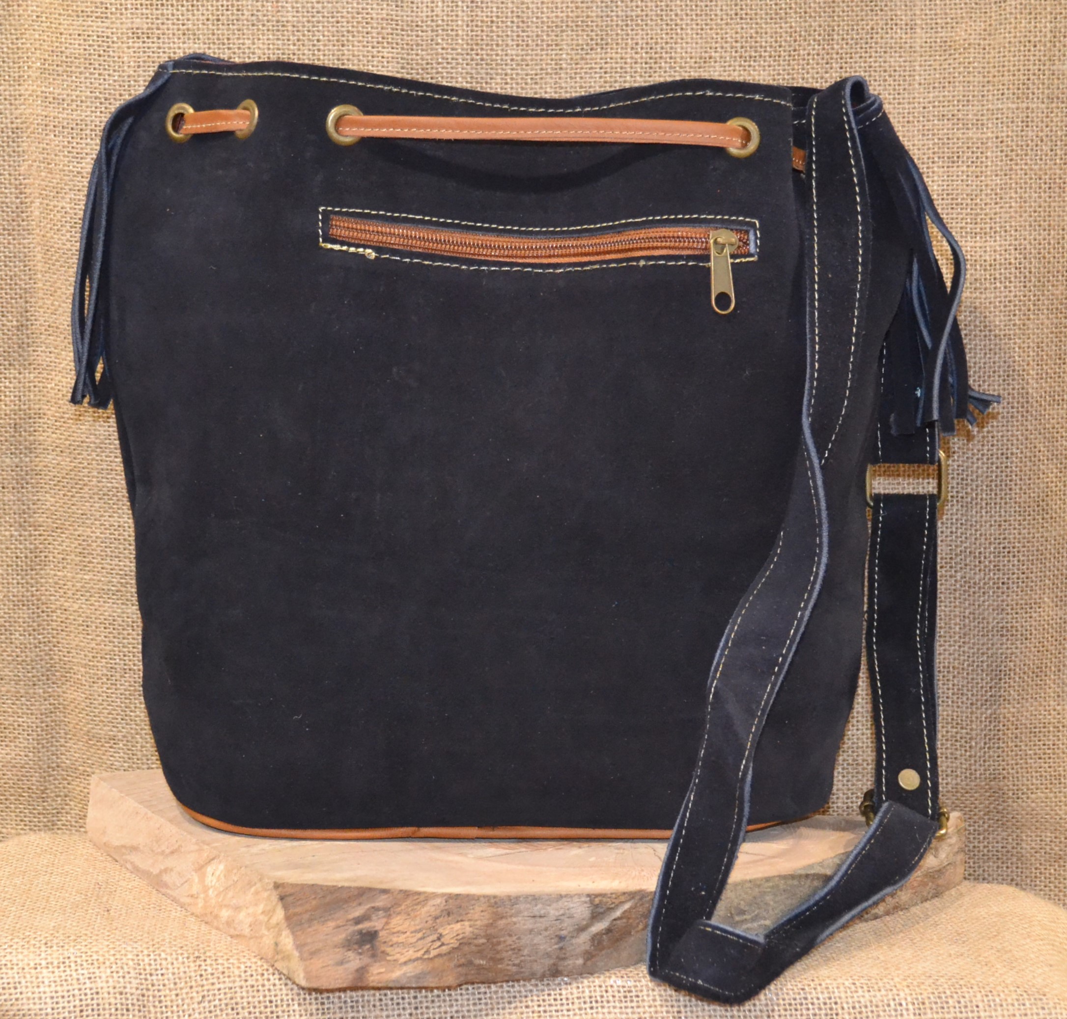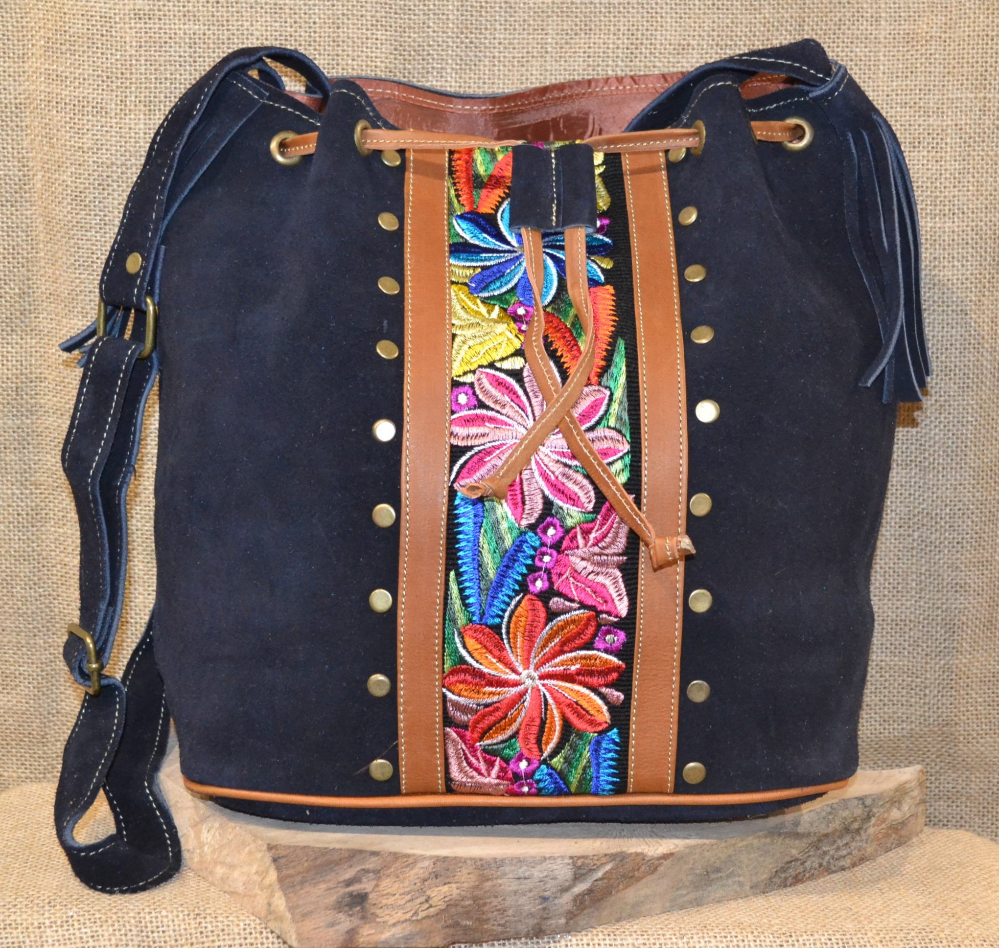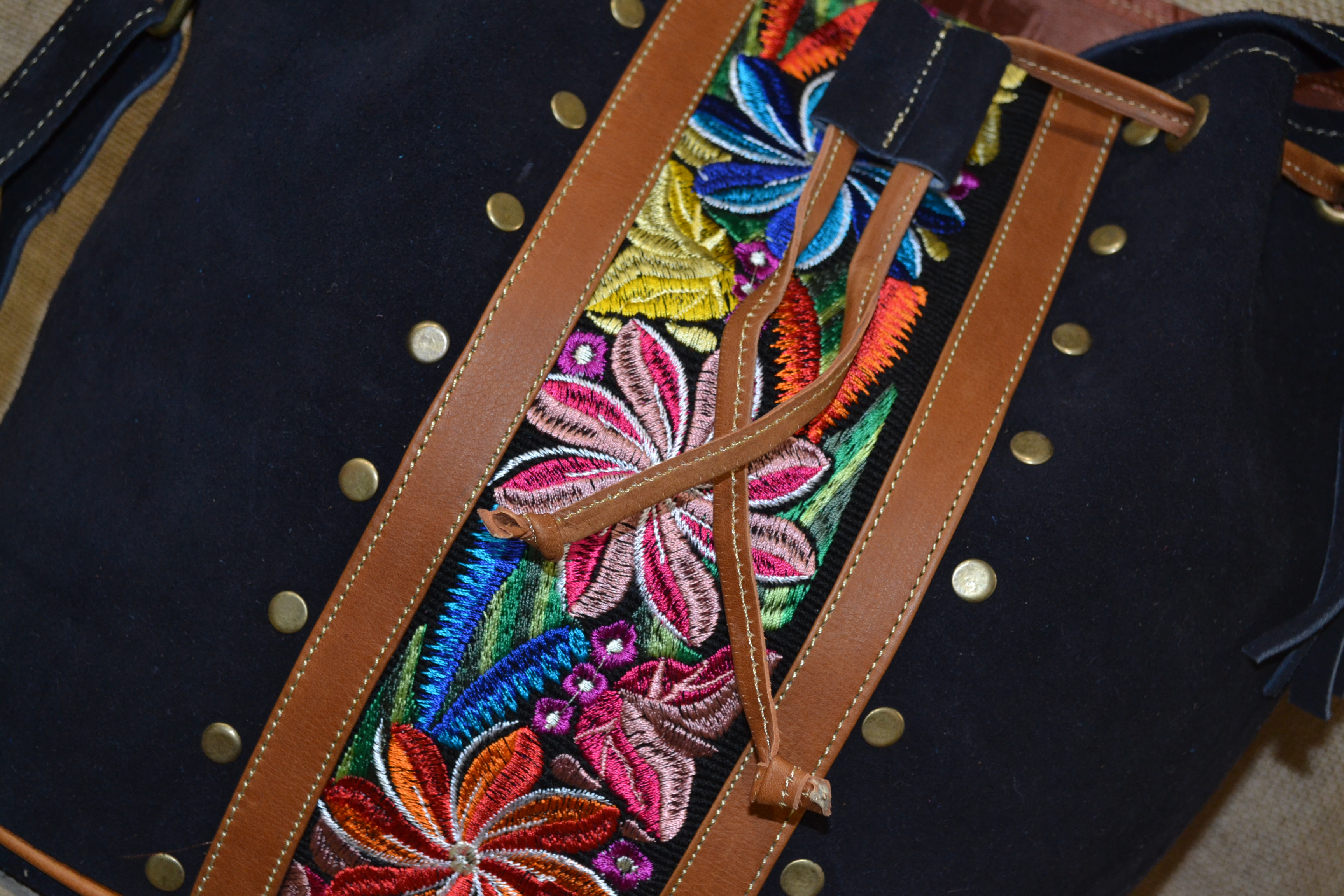 Co powiesz na mix zamszowej 100% naturalnej skóry w granatowym kolorze i oryginalnych etnicznych wzorów pochodzących od Indian Kiczua zamieszkujących po dziś dzień Andyjskie prowincje Ekwadoru . Torebka ta uszyta została w mały lokalnym warsztacie kaletniczym wysoko w Andach gdzie natura i kultura Indian wciąż nadają rytm codziennego dnia . Torebka typu worek ściągana rzemieniem nadaje się idealnie na codzienne sprawy z jakimi musisz się mierzyć każdego dnia. Torba posiada centralną komorę w która wszyto małą kieszonkę na drobiazgi.