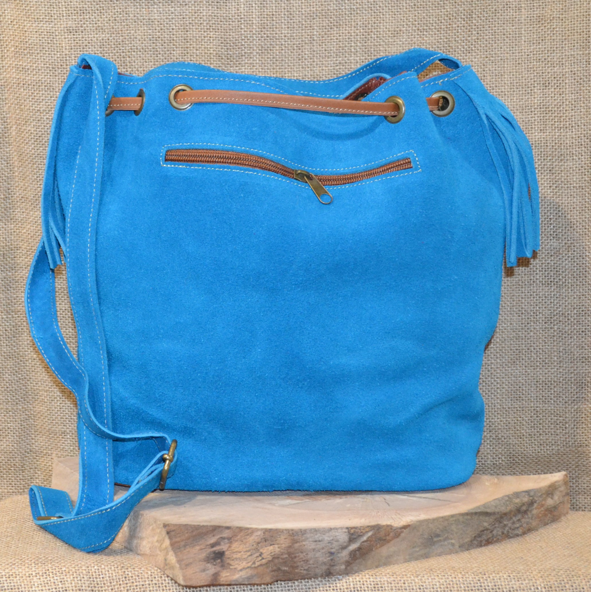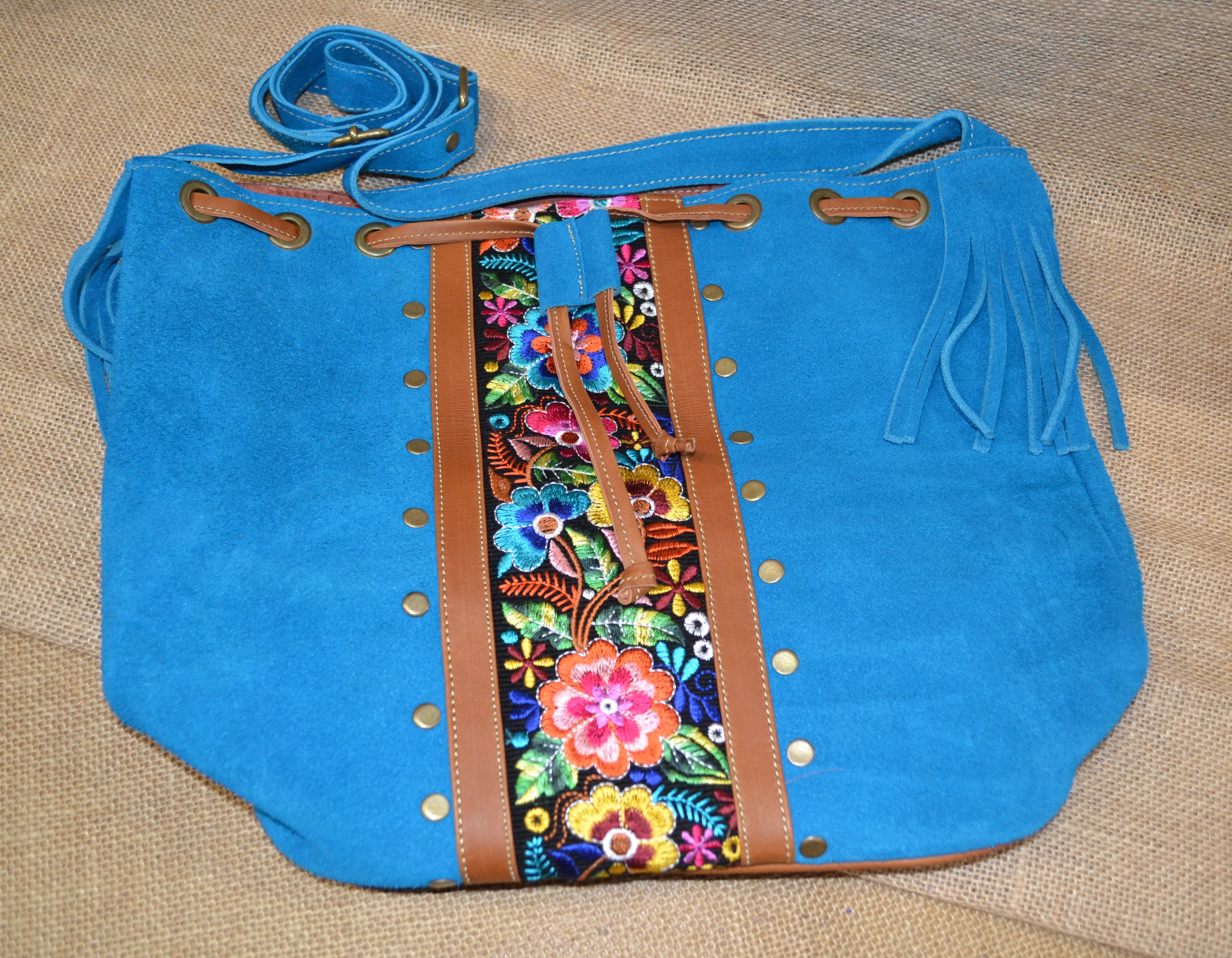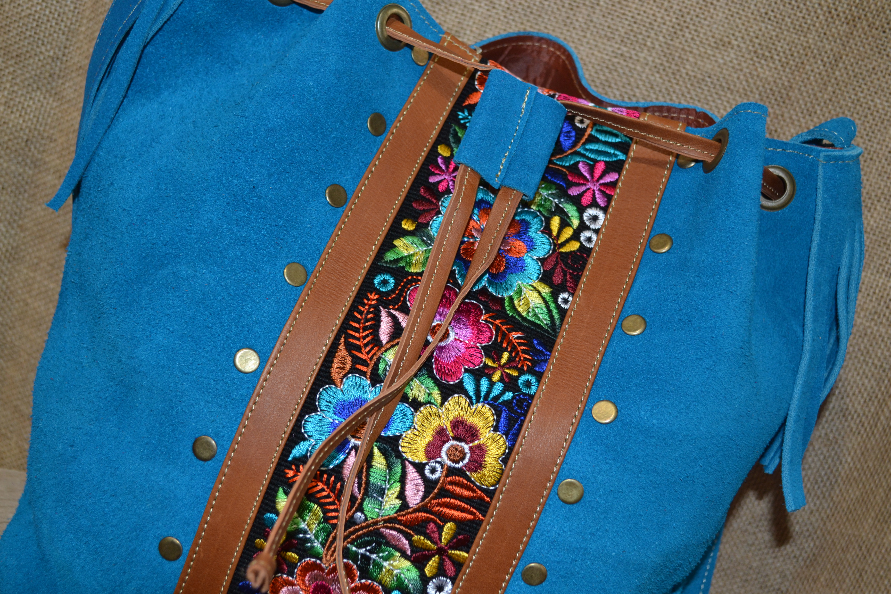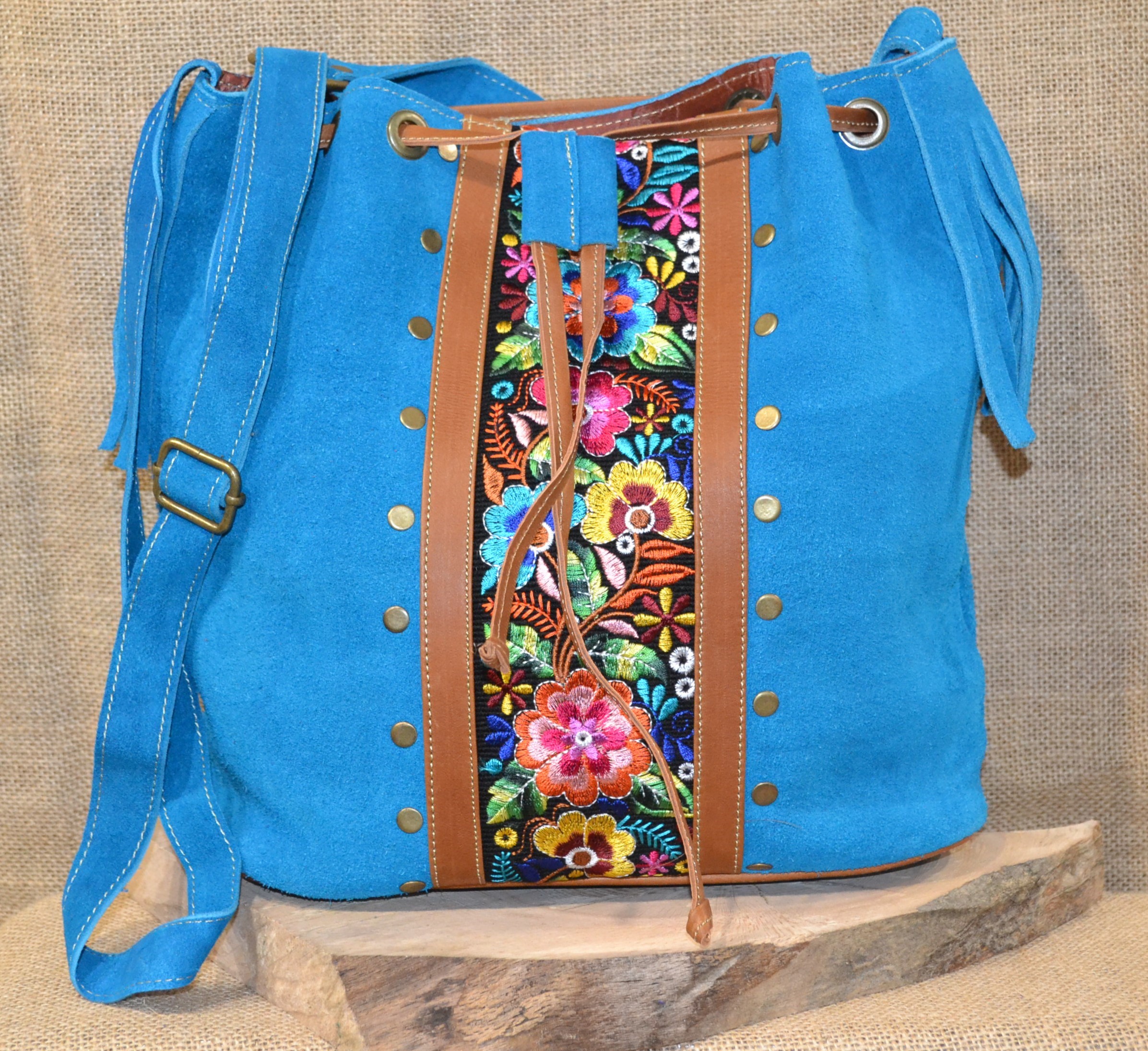 Co powiesz na mix zamszowej 100% naturalnej skóry w jasnoniebieskim kolorze i oryginalnych etnicznych wzorów pochodzących od Indian Kiczua zamieszkujących po dziś dzień Andyjskie prowincje Ekwadoru . Torebka ta uszyta została w mały lokalnym warsztacie kaletniczym wysoko w Andach gdzie natura i kultura Indian wciąż nadają rytm codziennego dnia . Torebka typu worek ściągana rzemieniem nadaje się idealnie na codzienne sprawy z jakimi musisz się mierzyć każdego dnia. Torba posiada centralną komorę w która wszyto małą kieszonkę na drobiazgi.
