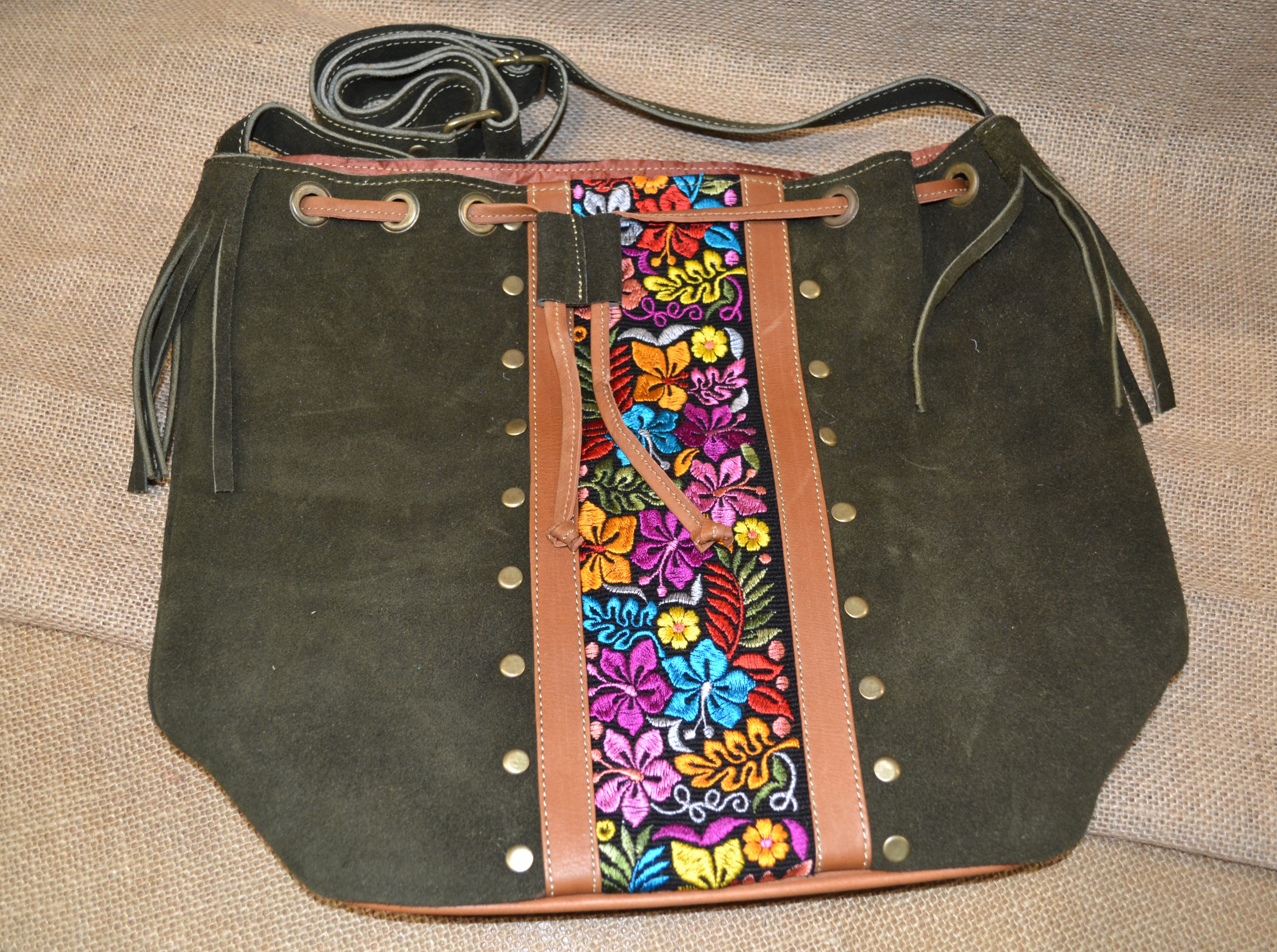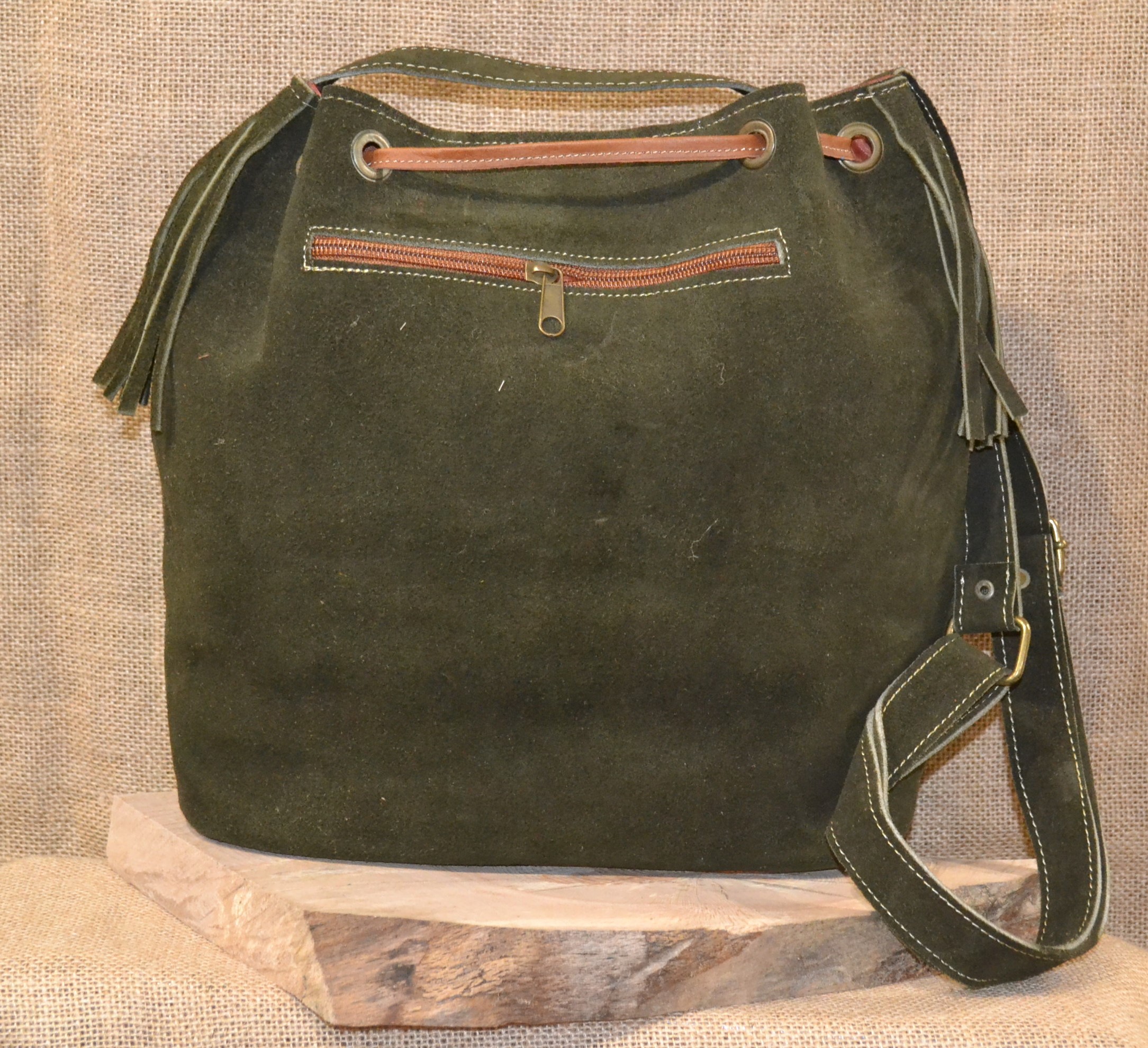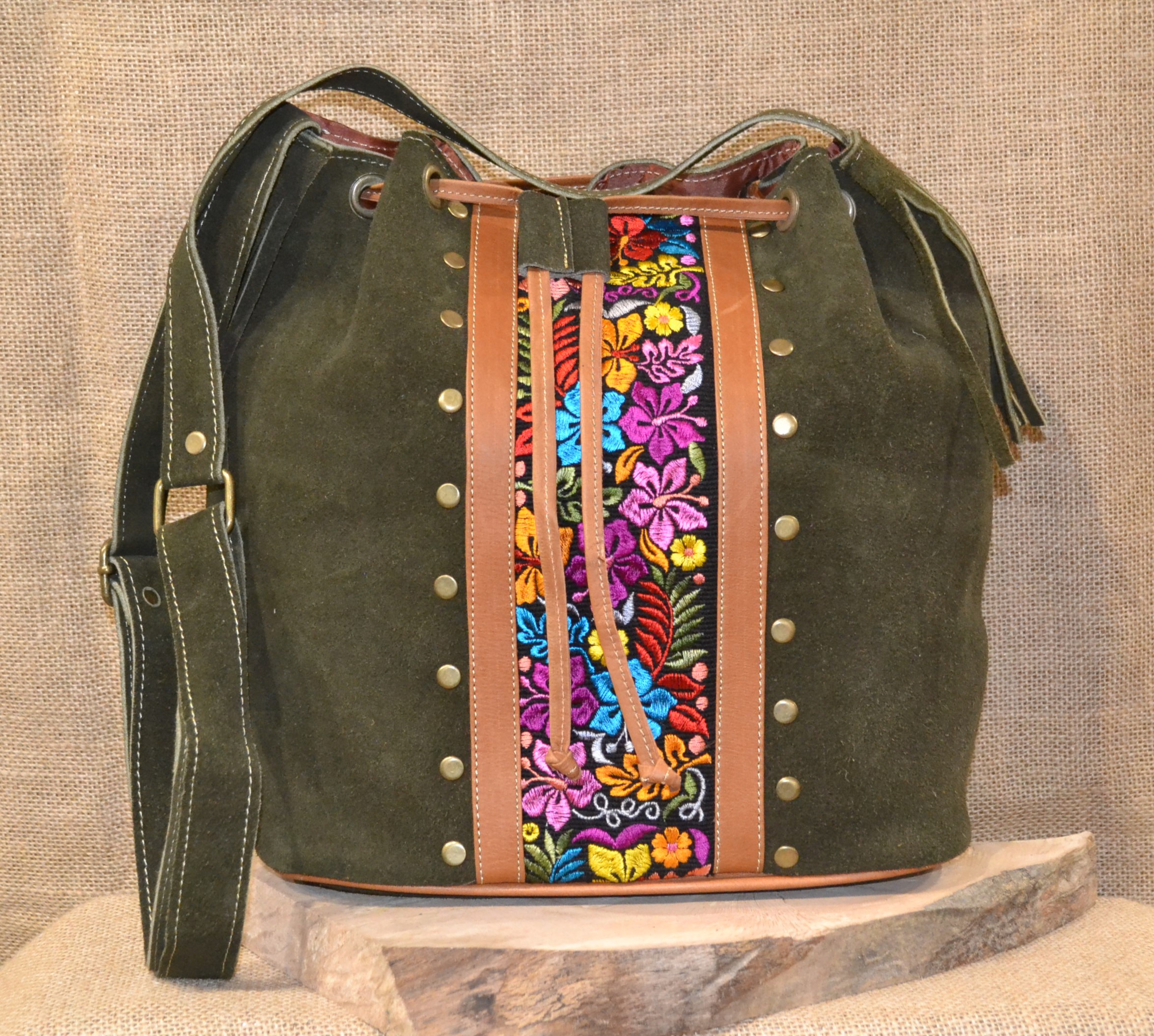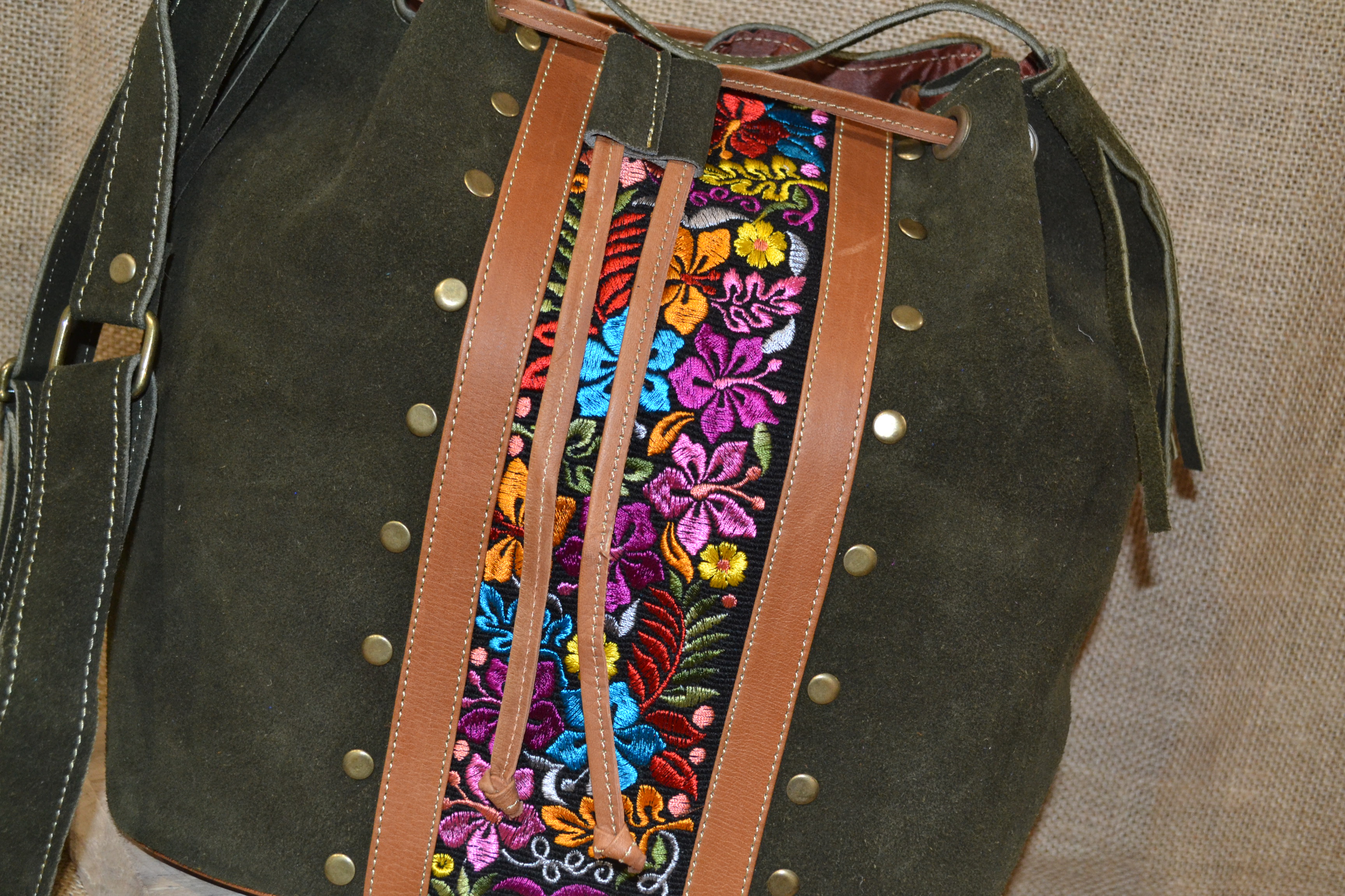 Co powiesz na mix zamszowej 100% naturalnej skóry w zielonym kolorze i oryginalnych etnicznych wzorów pochodzących od Indian Kiczua zamieszkujących po dziś dzień Andyjskie prowincje Ekwadoru . Torebka ta uszyta została w mały lokalnym warsztacie kaletniczym wysoko w Andach gdzie natura i kultura Indian wciąż nadają rytm codziennego dnia . Torebka typu worek ściągana rzemieniem nadaje się idealnie na codzienne sprawy z jakimi musisz się mierzyć każdego dnia. Torba posiada centralną komorę w która wszyto małą kieszonkę na drobiazgi.