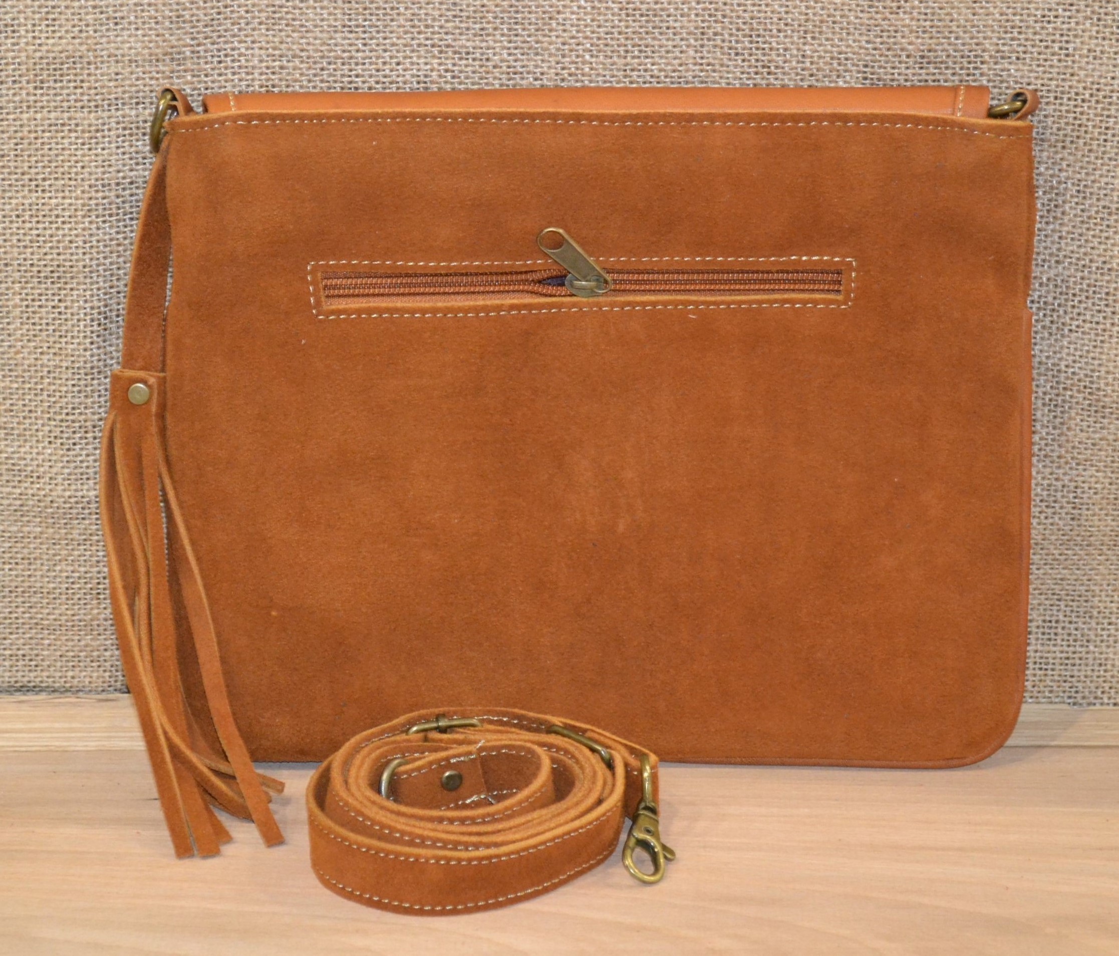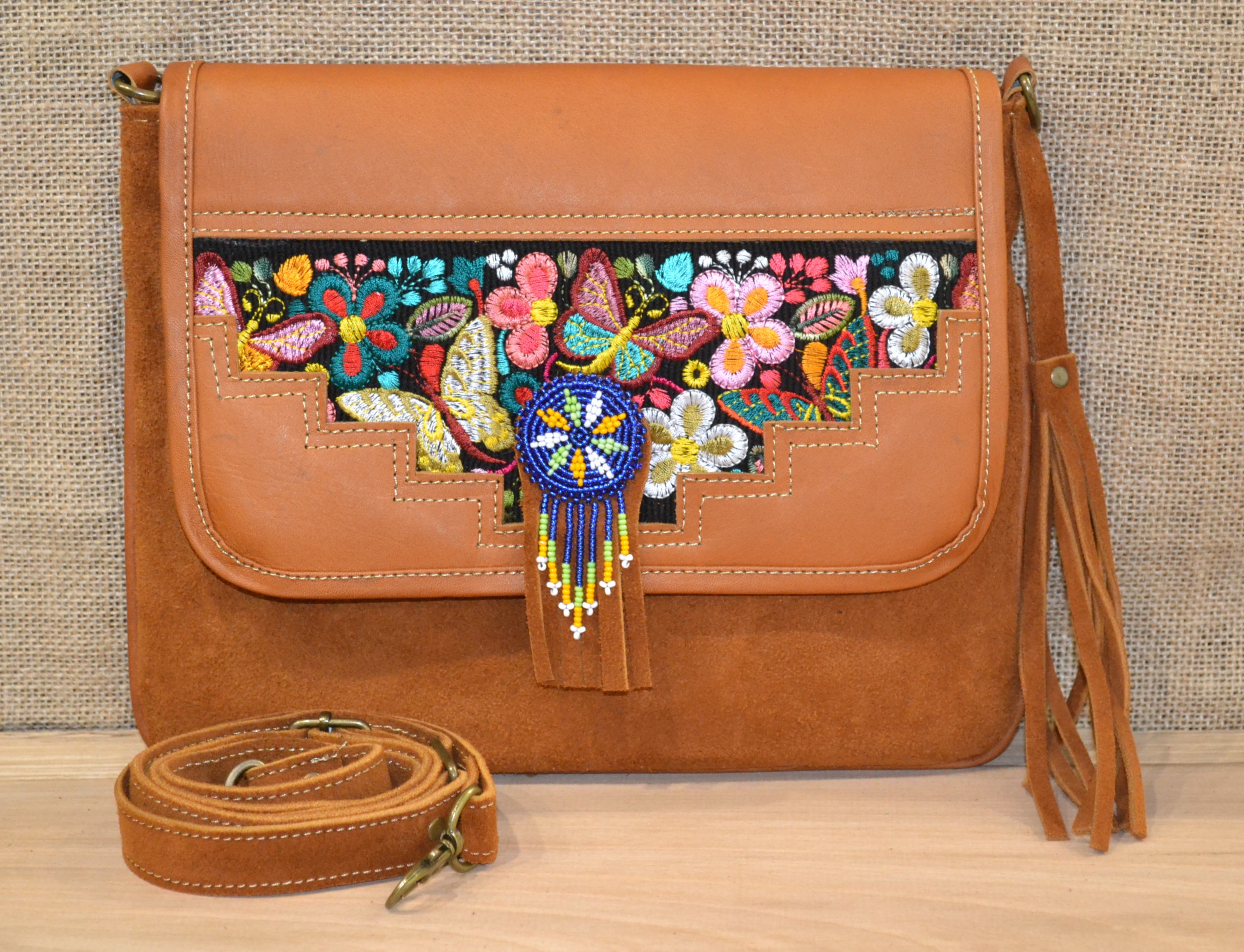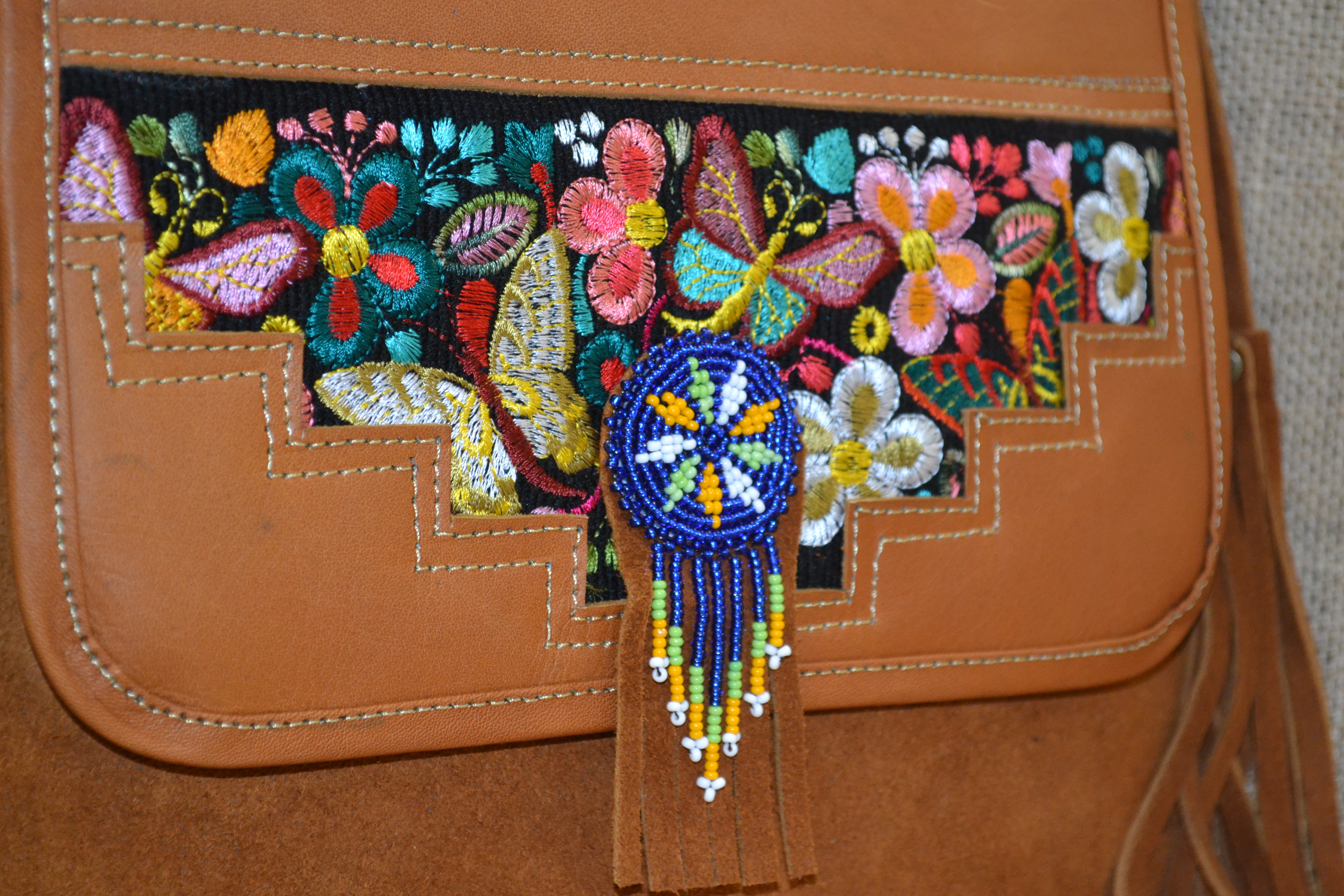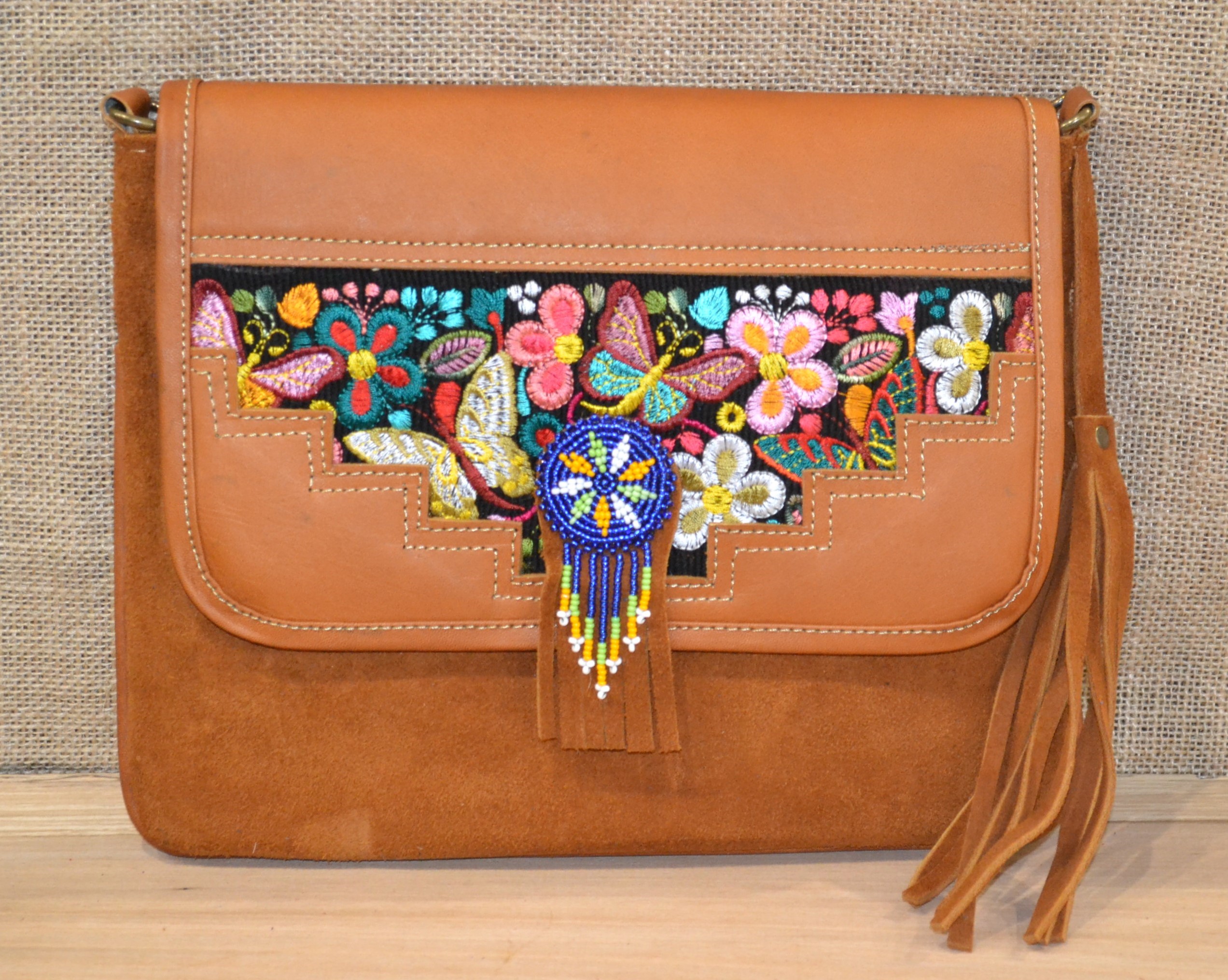 Torebka wykonana ze 100% skóry bydlęcej w kolorze brązowym w połączeniu z tkaniną pokrytą kolorowymi etnicznymi symbolami to doskonale skomponowany produkt który zachwyca swoją niepowtarzalnością i unikalnością .