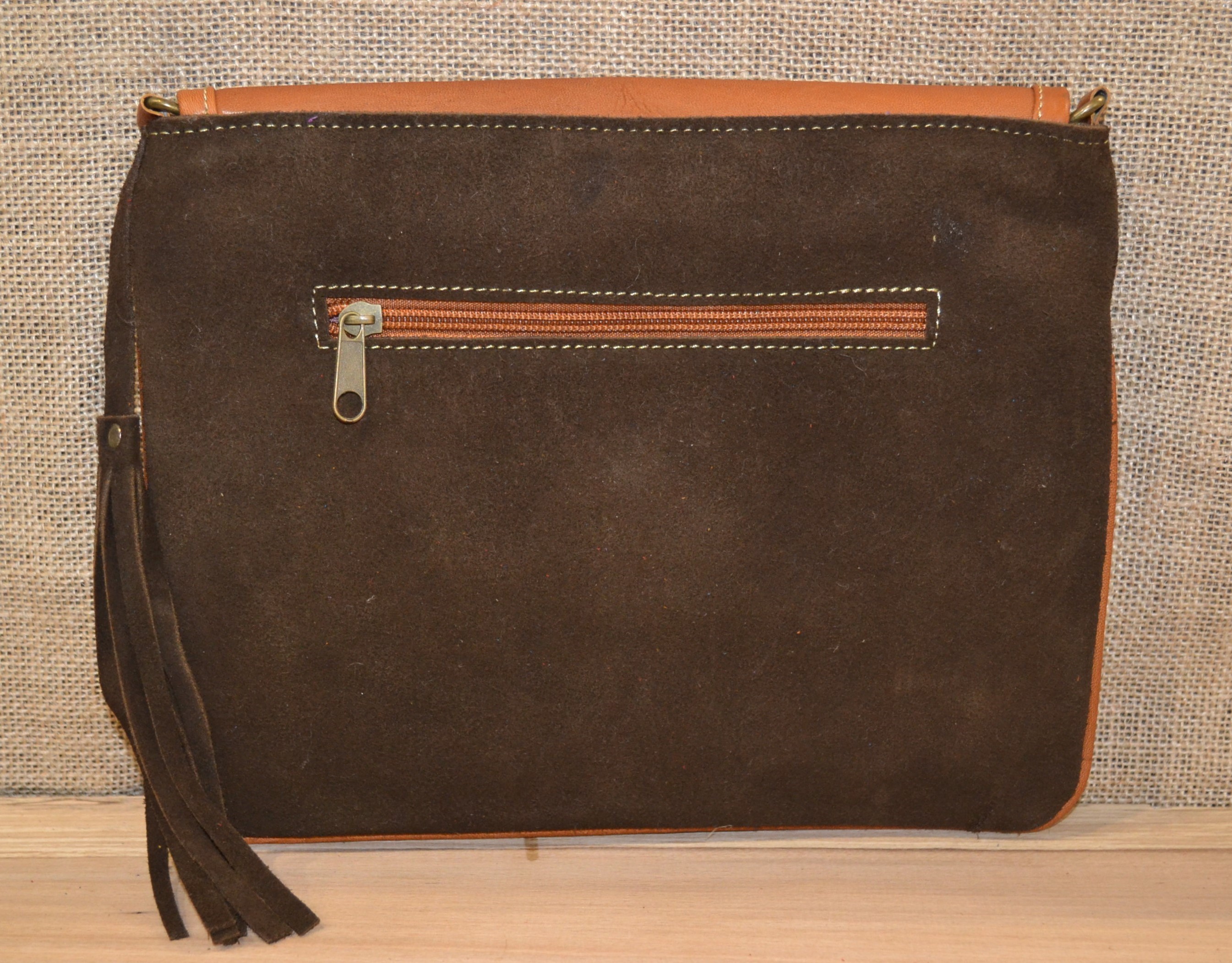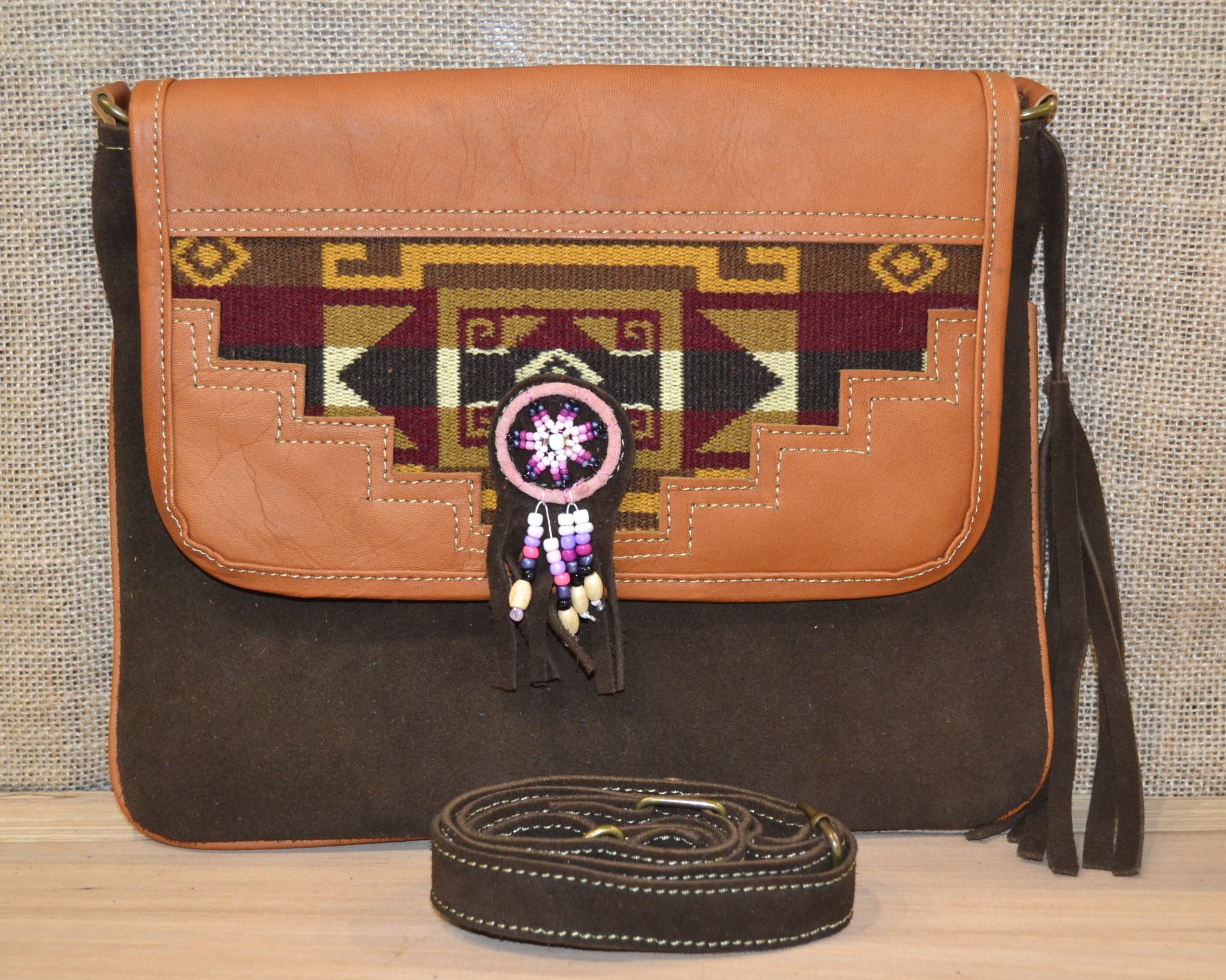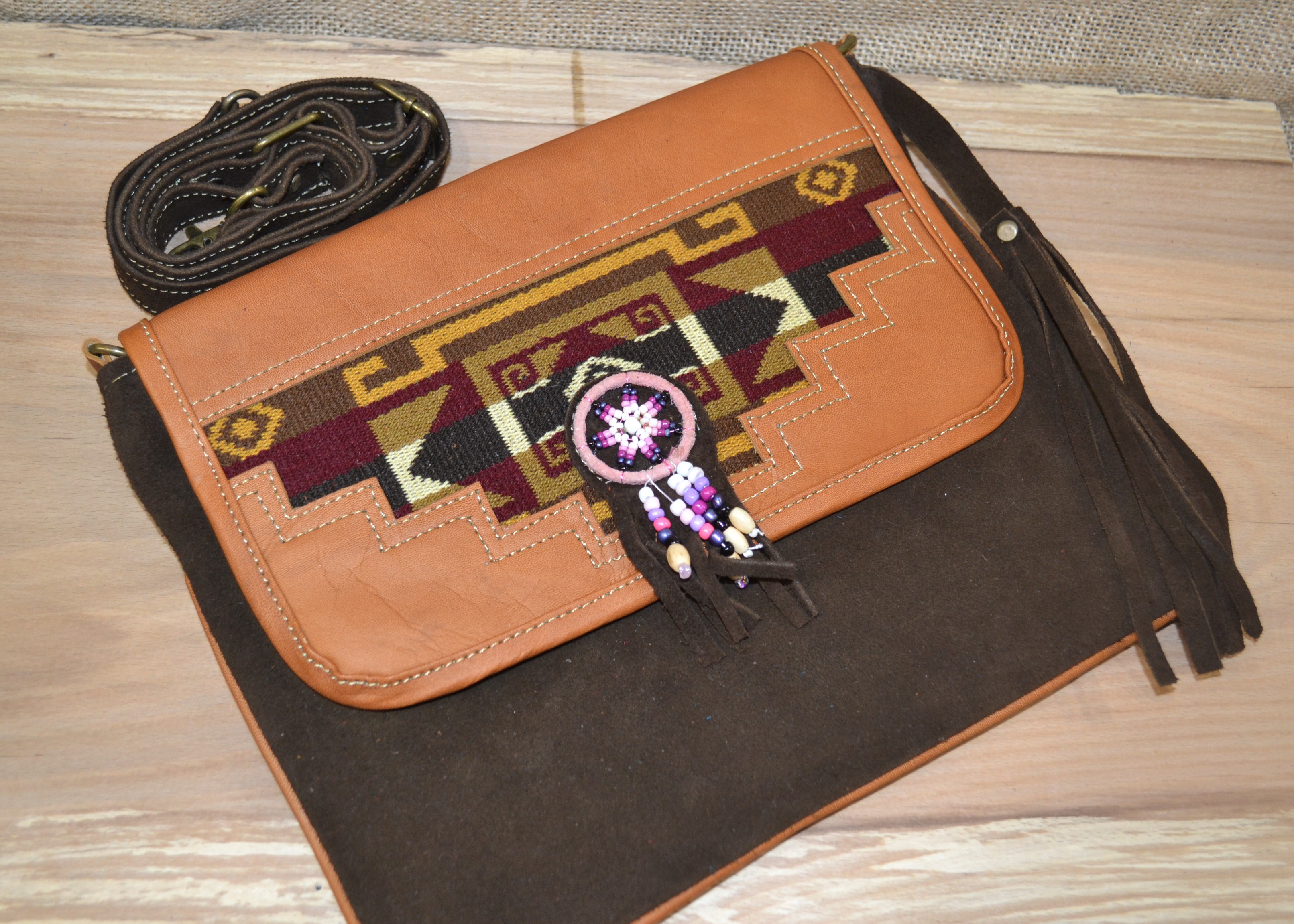 Torebka wykonana ze 100% skóry bydlęcej w kolorze ciemnobrązowym w połączeniu z tkaniną pokrytą kolorowymi etnicznymi symbolami to doskonale skomponowany produkt który zachwyca swoją niepowtarzalnością i unikalnością .