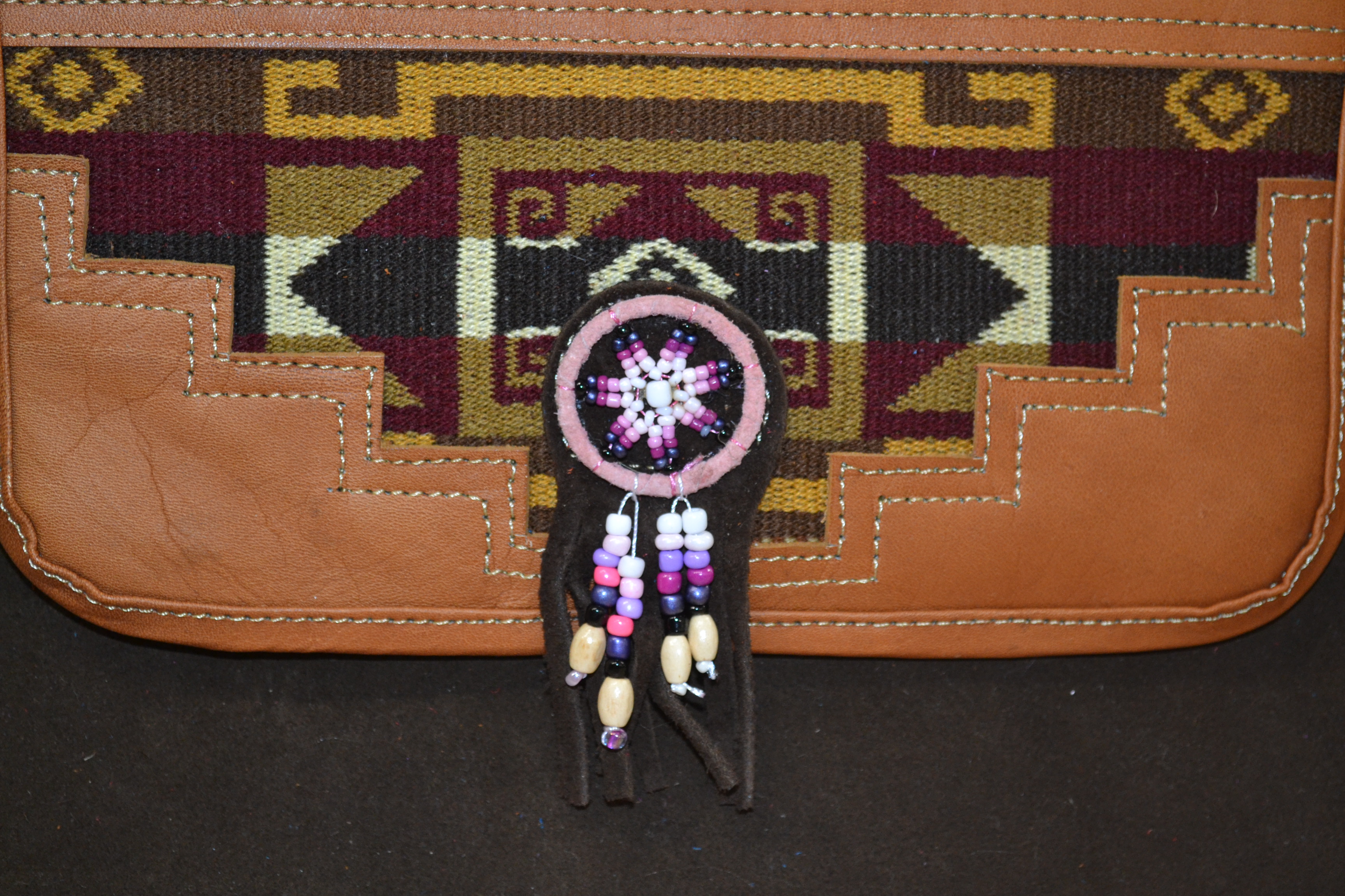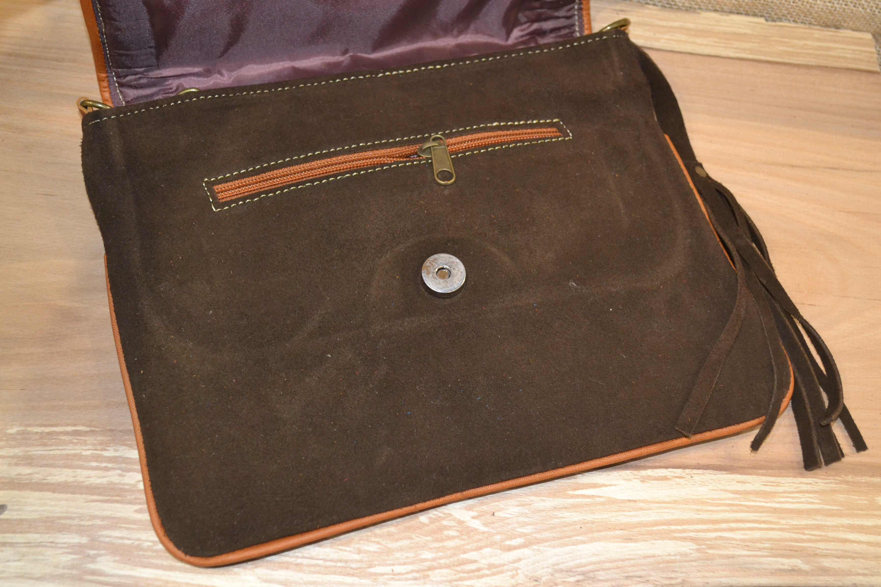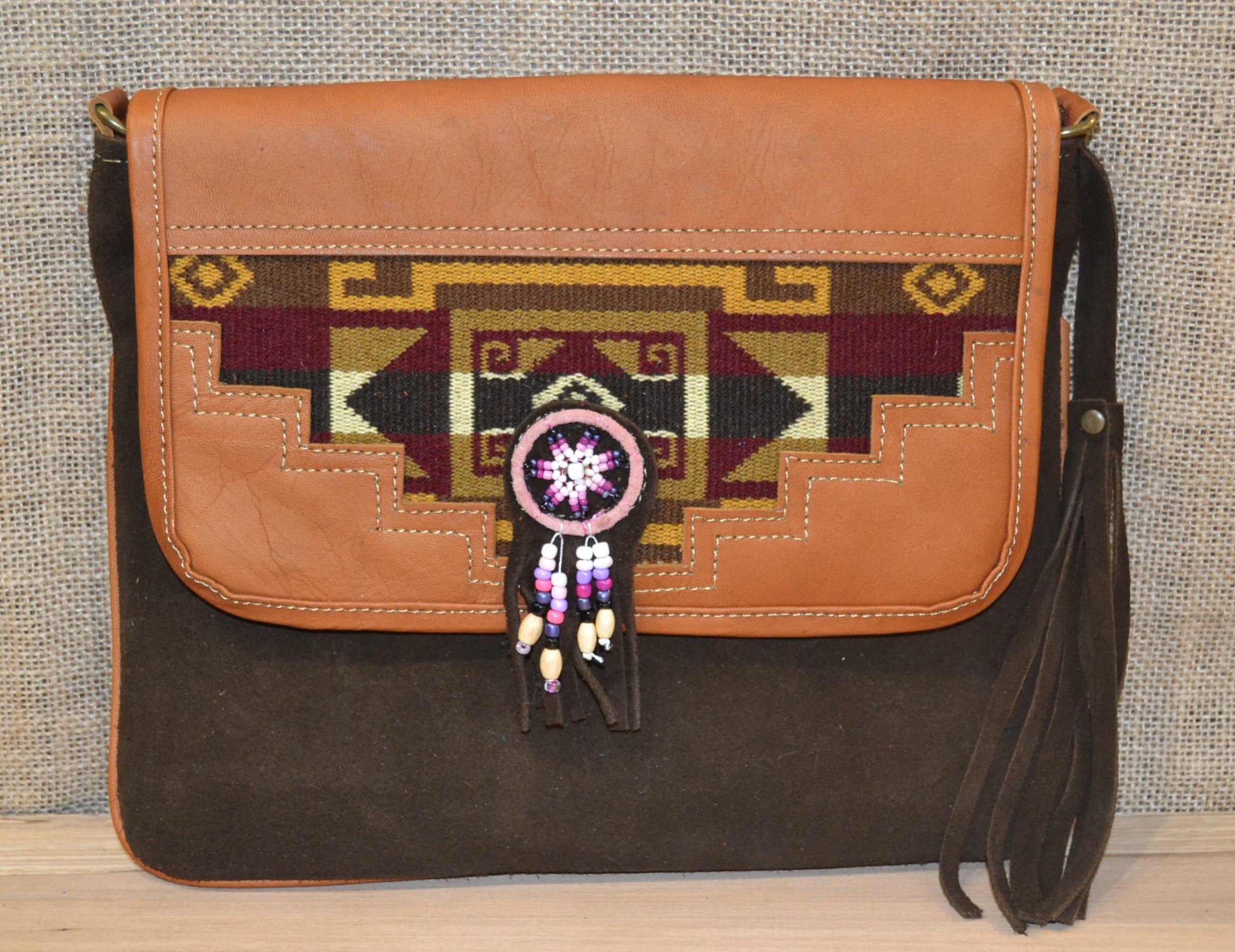 Torebka wykonana ze 100% skóry bydlęcej w kolorze ciemnobrązowym w połączeniu z tkaniną pokrytą kolorowymi etnicznymi symbolami to doskonale skomponowany produkt który zachwyca swoją niepowtarzalnością i unikalnością .