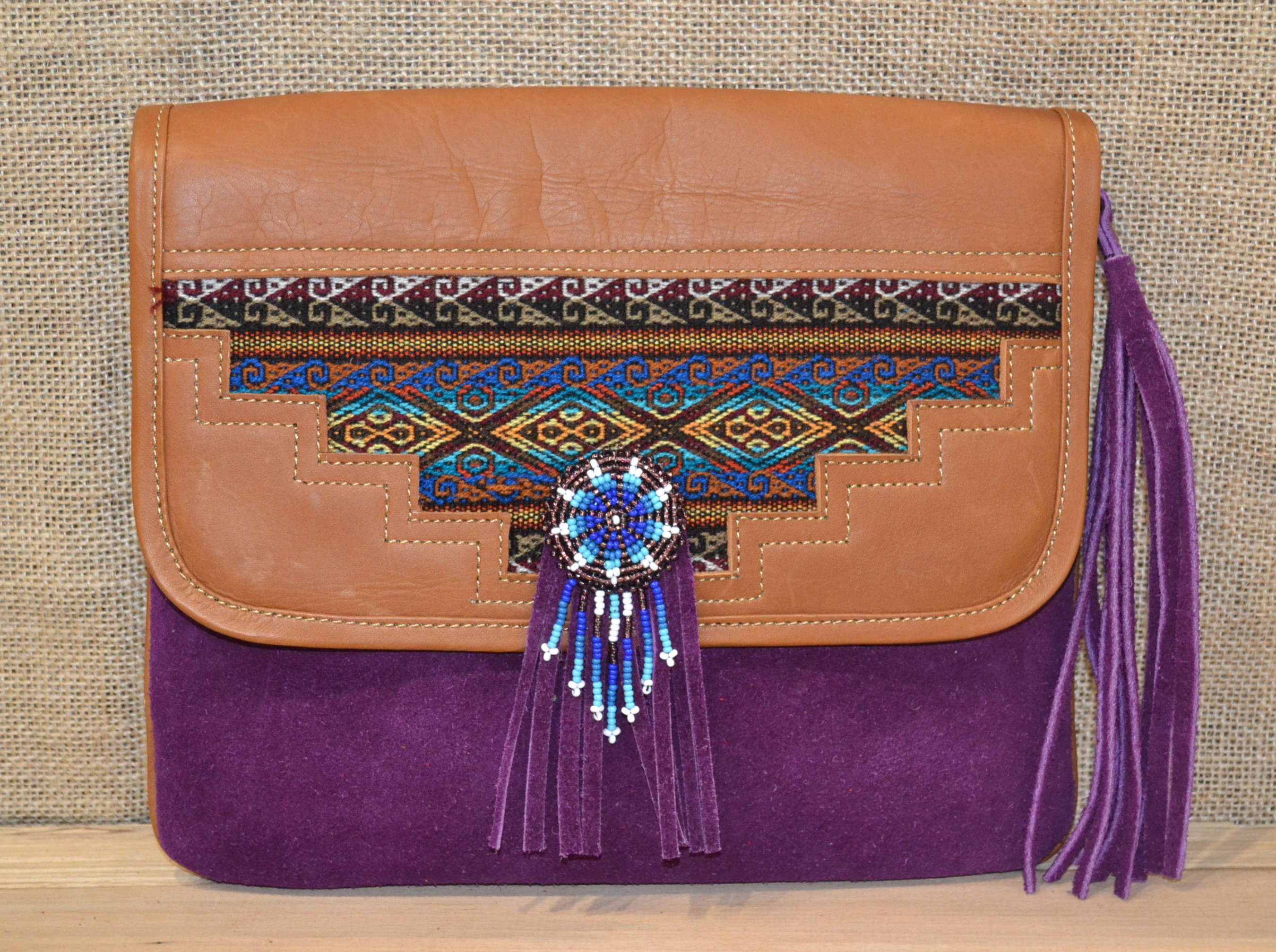 Torebka wykonana ze 100% skóry bydlęcej w kolorze fioletowym w połączeniu z tkaniną pokrytą kolorowymi etnicznymi symbolami to doskonale skomponowany produkt który zachwyca swoją niepowtarzalnością i unikalnością .