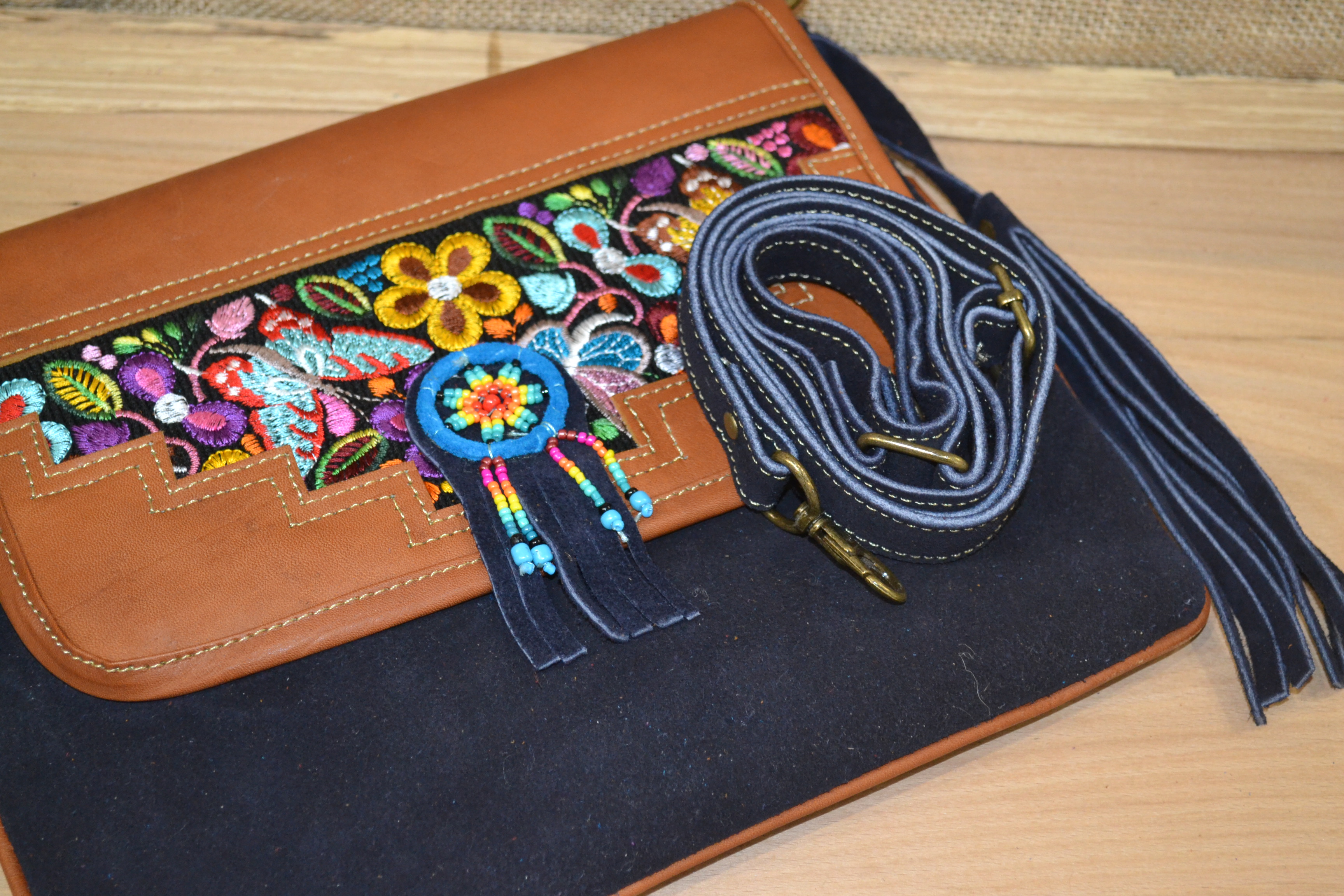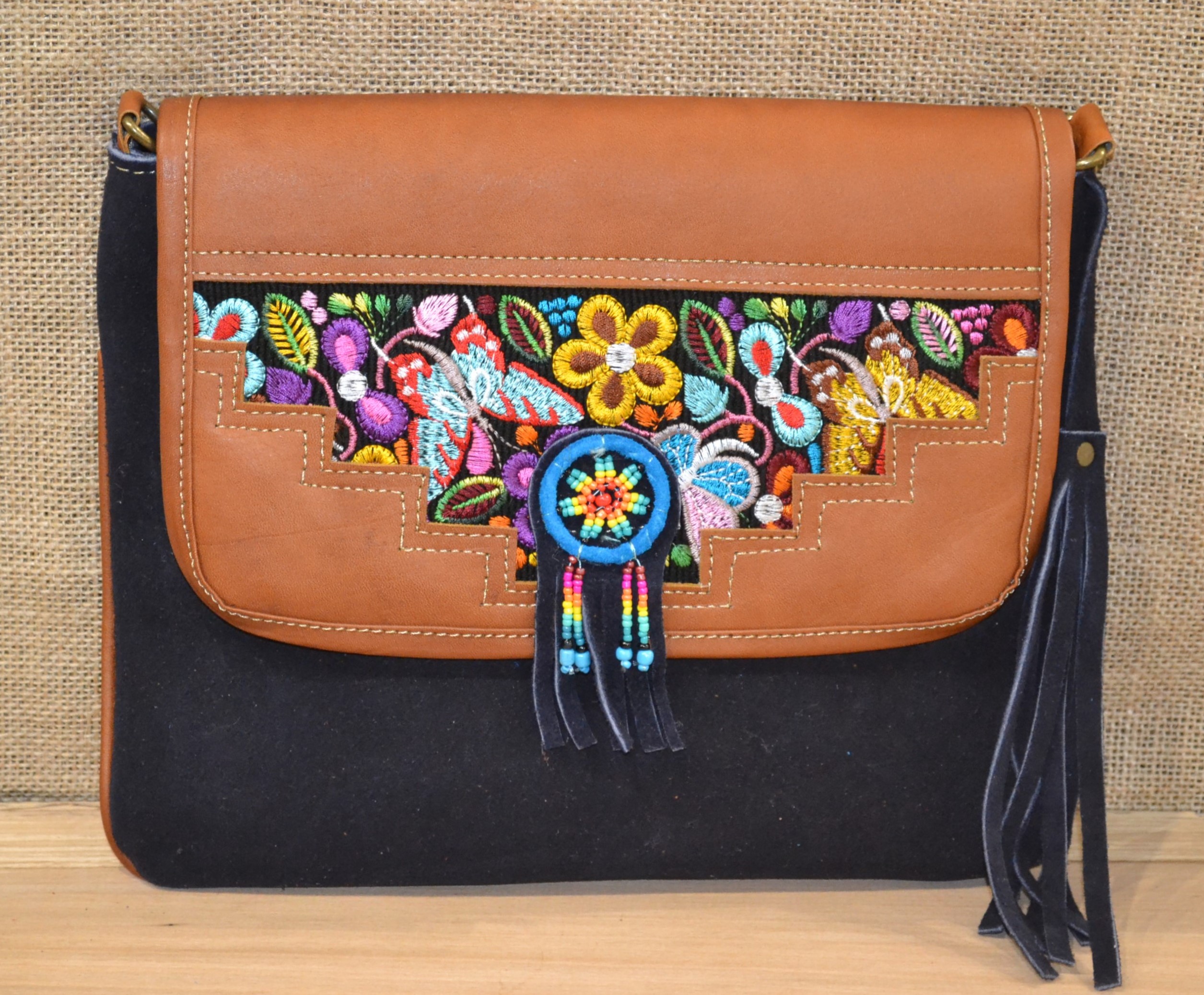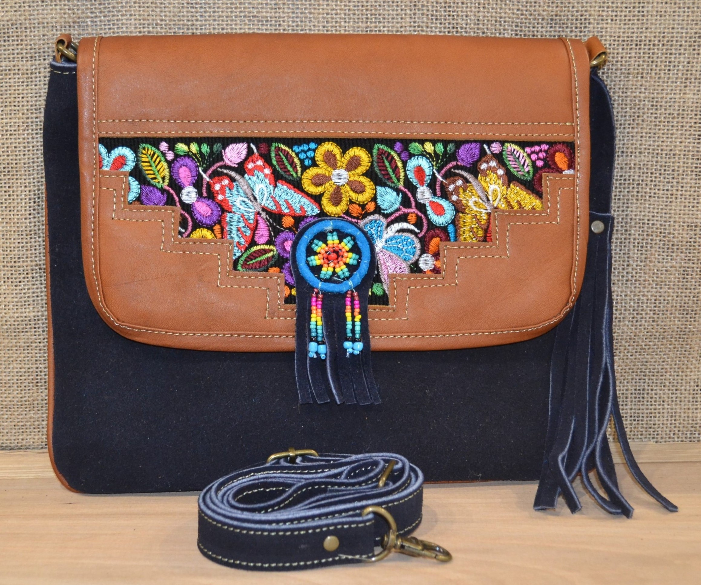 Torebka wykonana ze 100% skóry bydlęcej w kolorze granatowym w połączeniu z tkaniną pokrytą kolorowymi etnicznymi symbolami to doskonale skomponowany produkt który zachwyca swoją niepowtarzalnością i unikalnością .