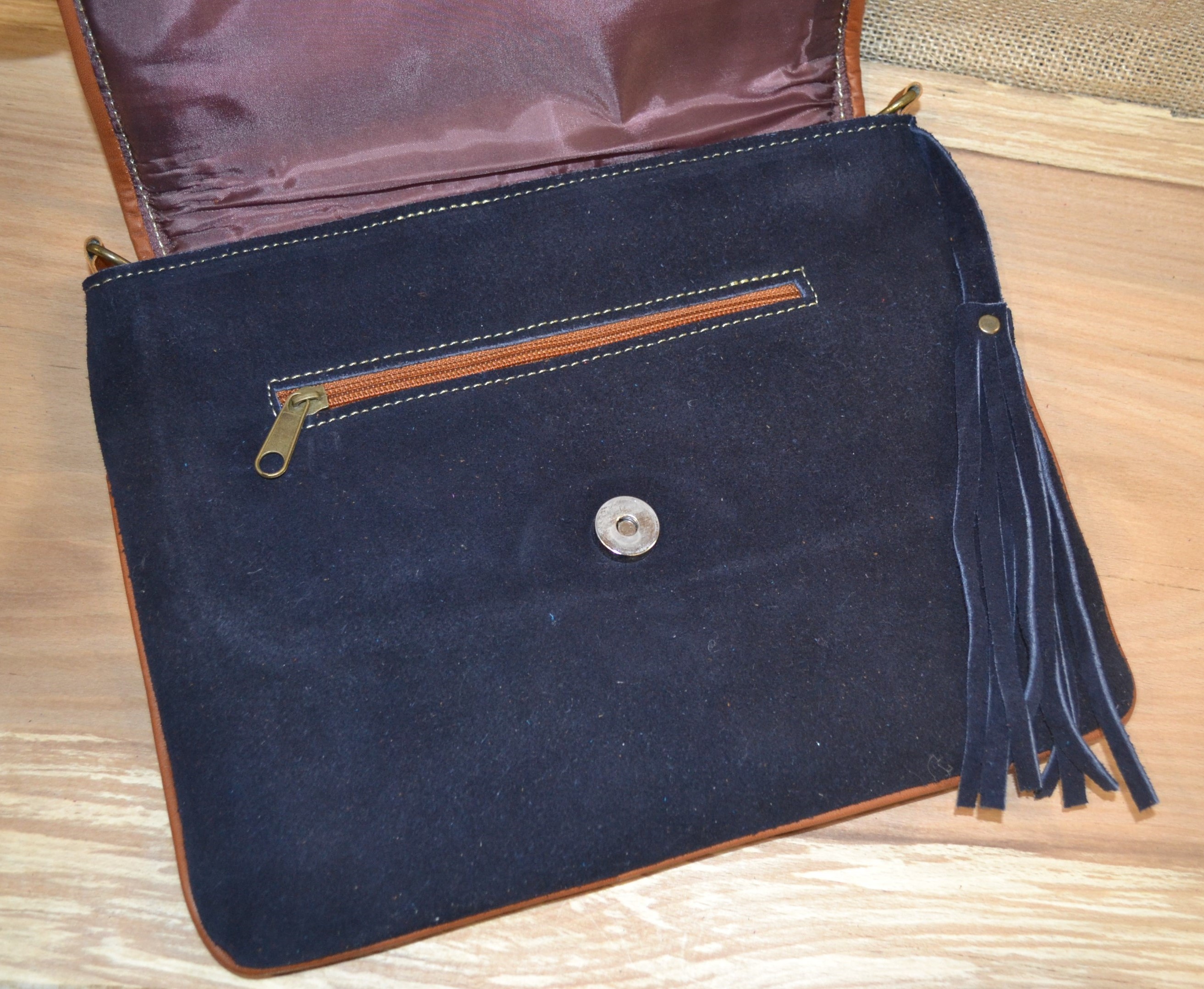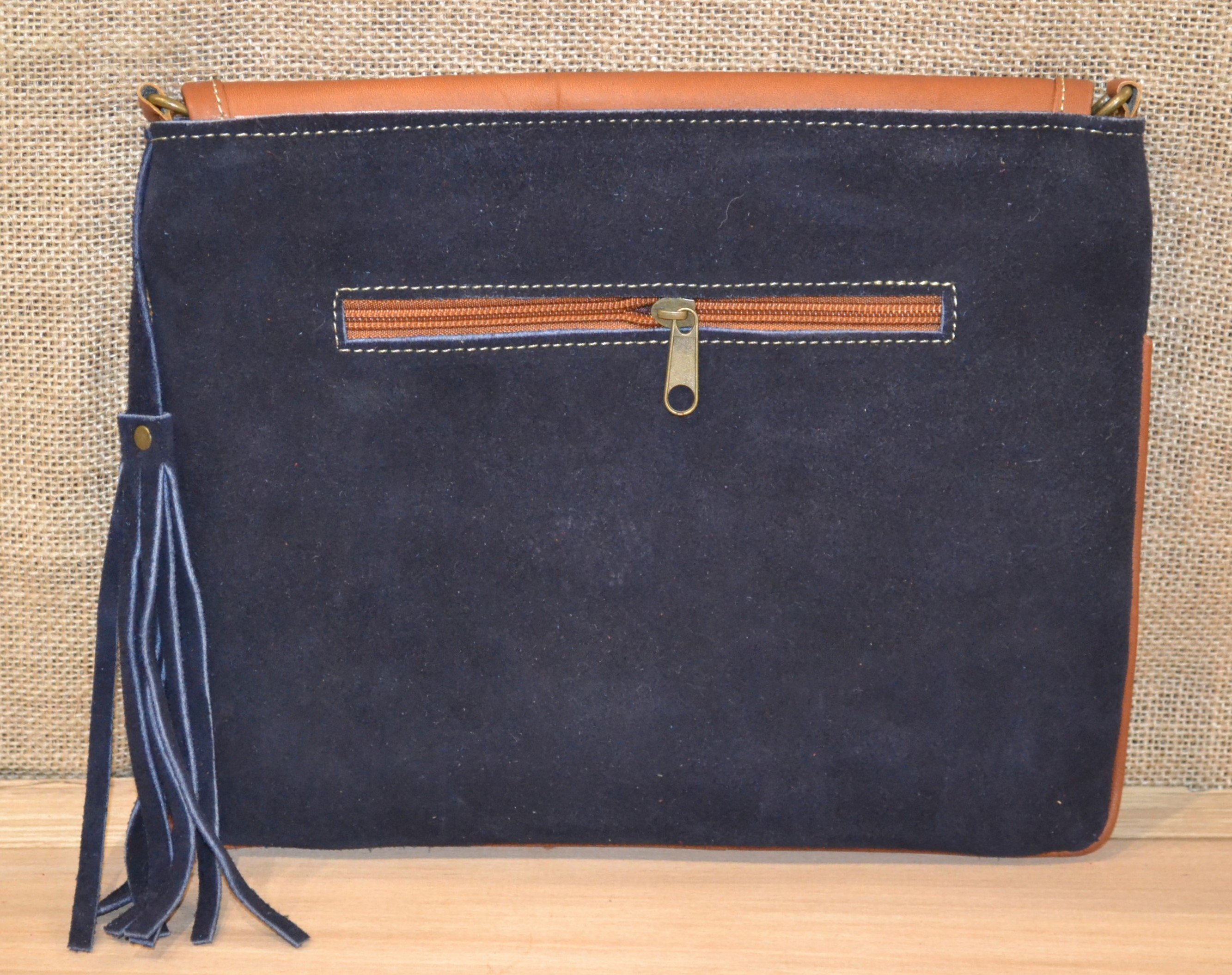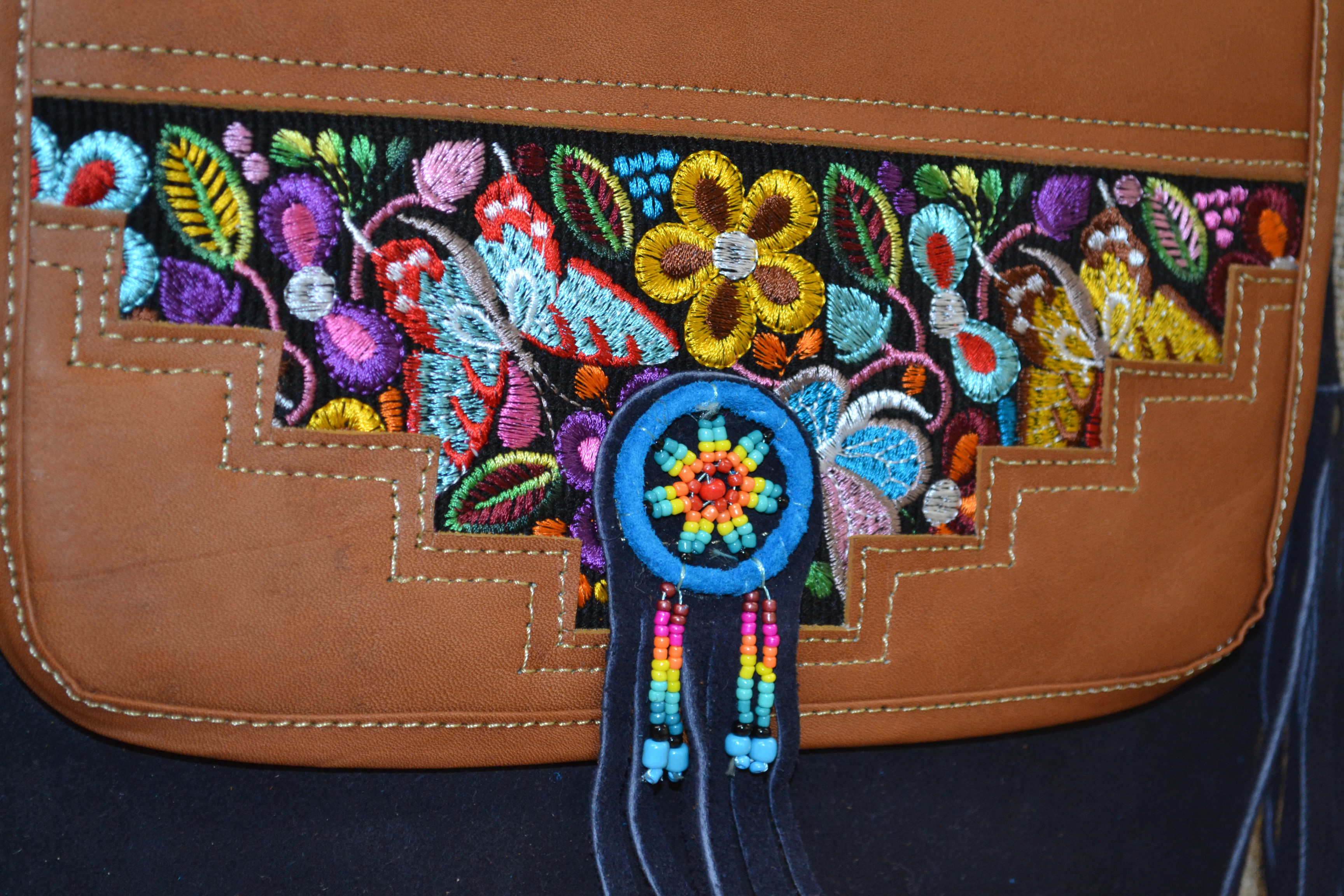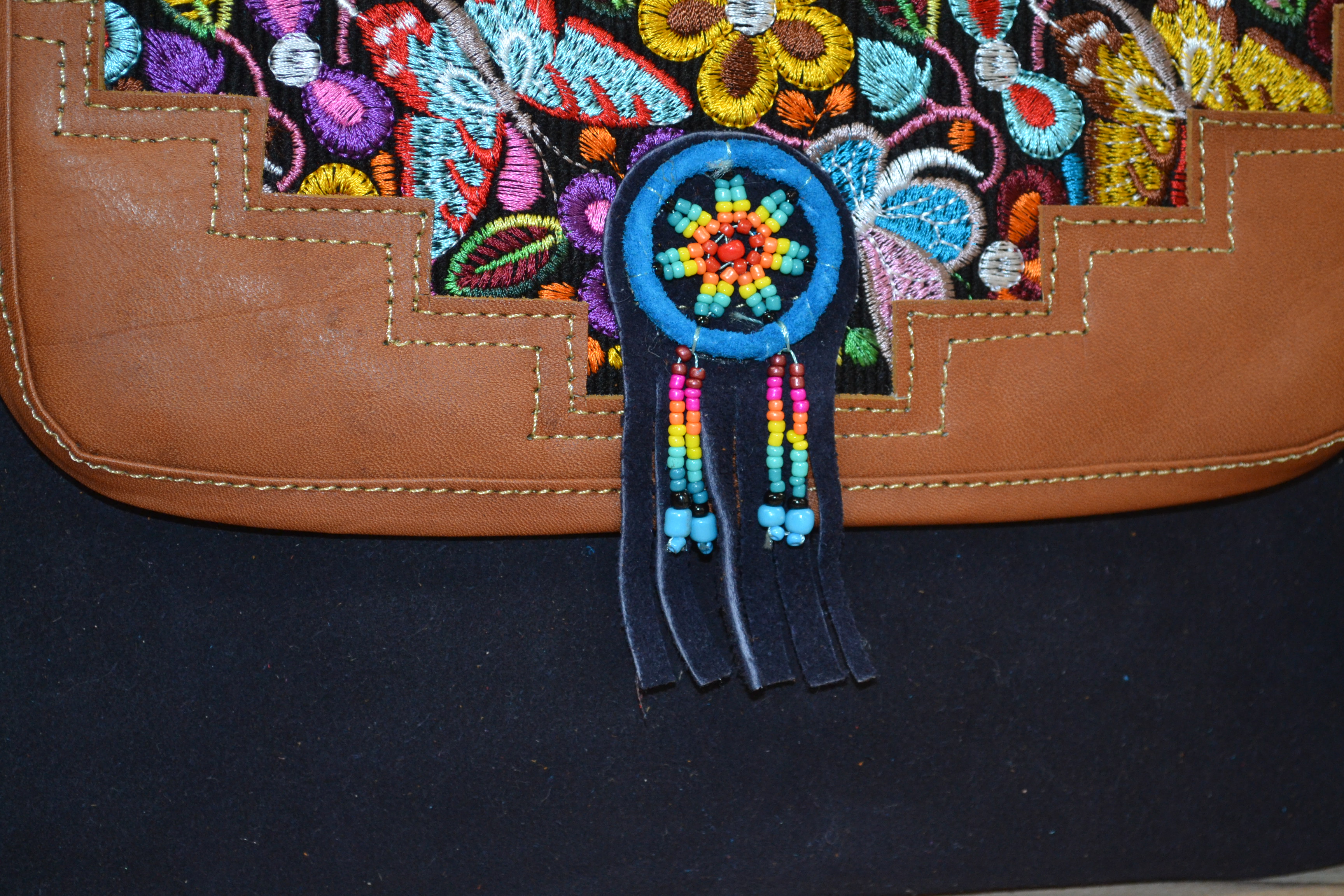 Torebka wykonana ze 100% skóry bydlęcej w kolorze granatowym w połączeniu z tkaniną pokrytą kolorowymi etnicznymi symbolami to doskonale skomponowany produkt który zachwyca swoją niepowtarzalnością i unikalnością .