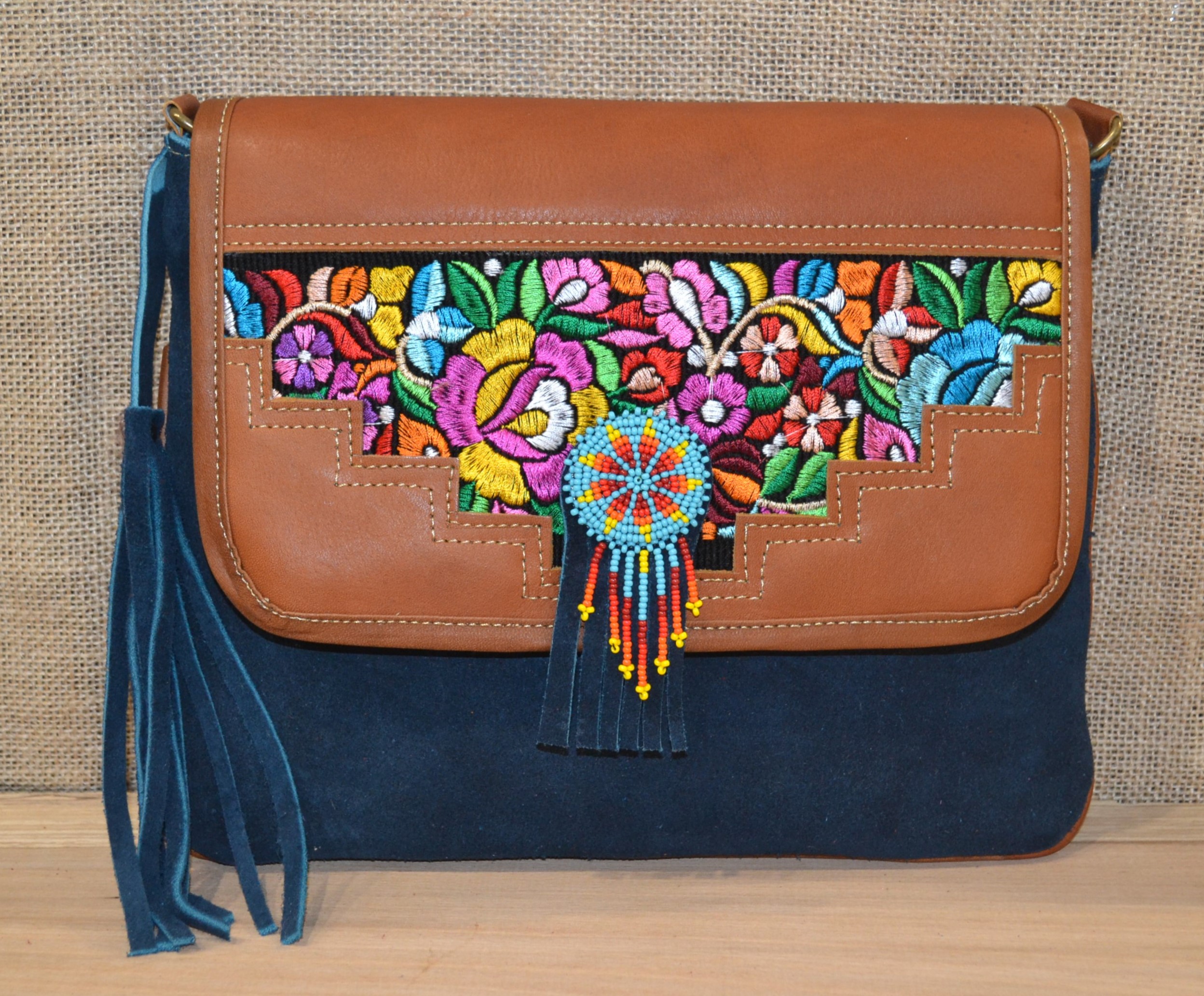 Torebka wykonana ze 100% skóry bydlęcej w kolorze granatowym w połączeniu z tkaniną pokrytą kolorowymi etnicznymi symbolami to doskonale skomponowany produkt który zachwyca swoją niepowtarzalnością i unikalnością .