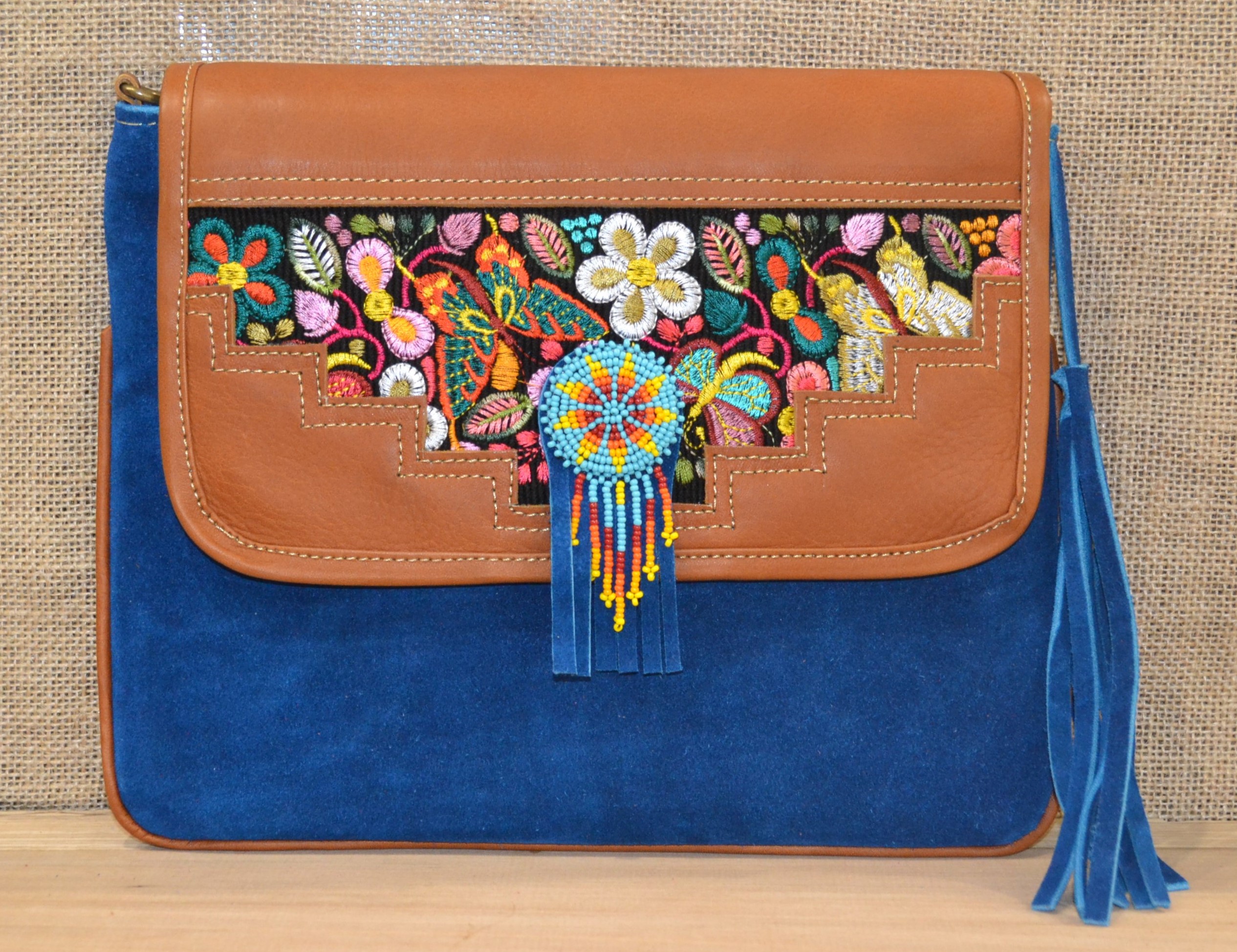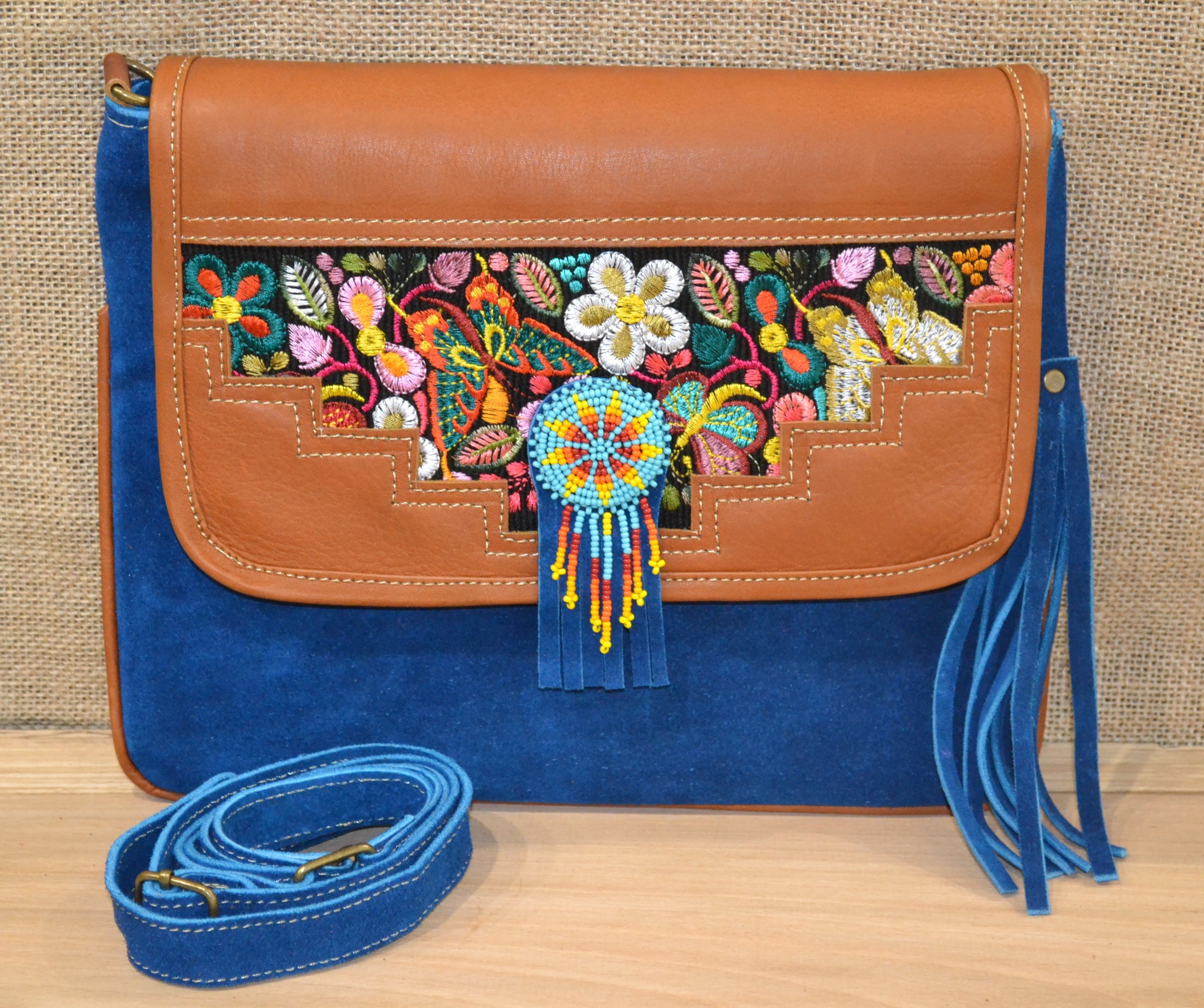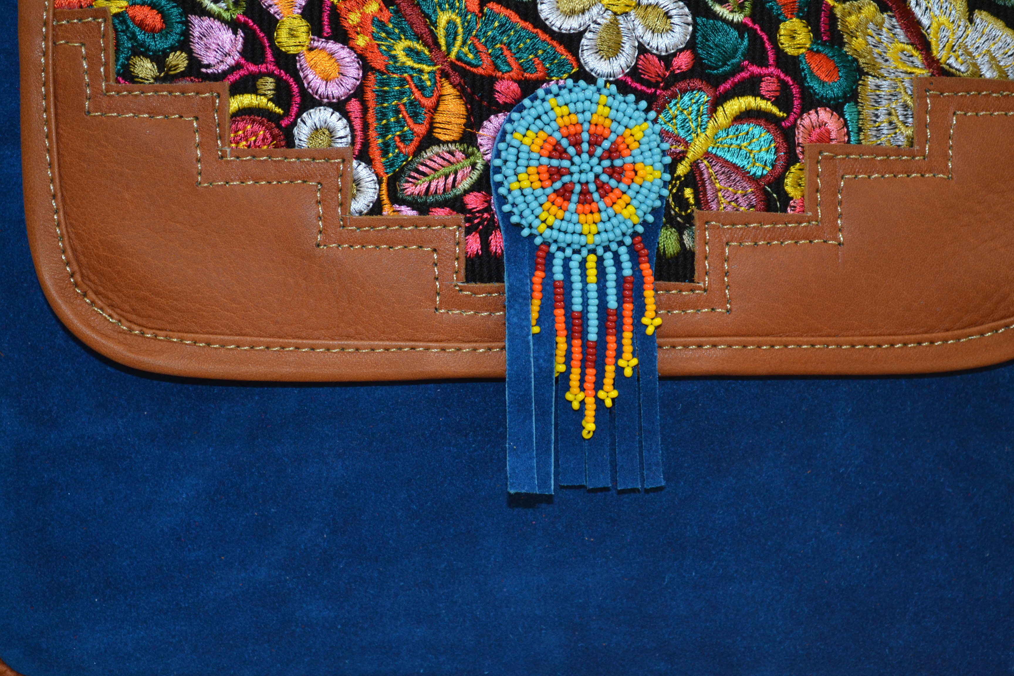 Torebka wykonana ze 100% skóry bydlęcej w kolorze niebieskim w połączeniu z tkaniną pokrytą kolorowymi etnicznymi symbolami to doskonale skomponowany produkt który zachwyca swoją niepowtarzalnością i unikalnością .