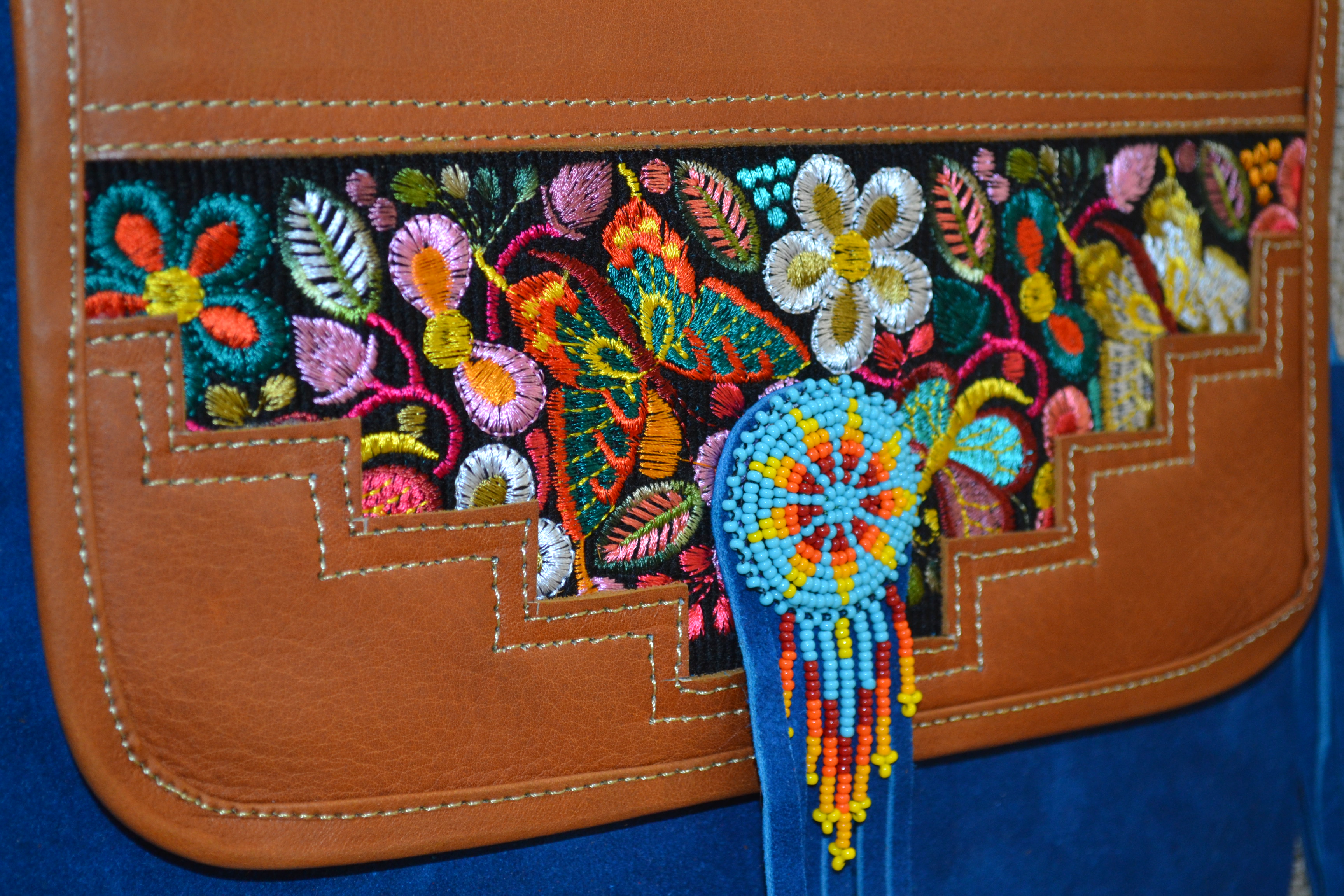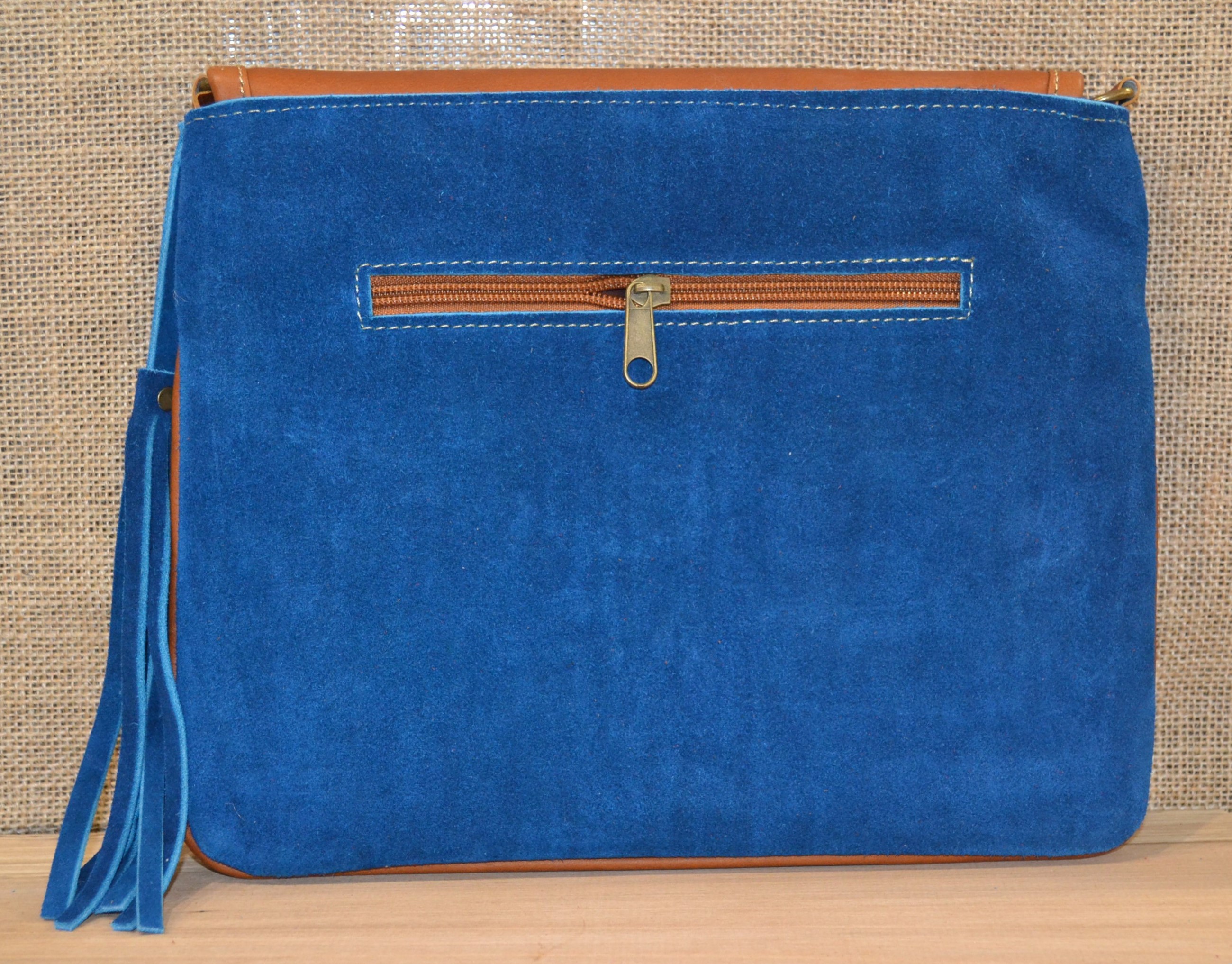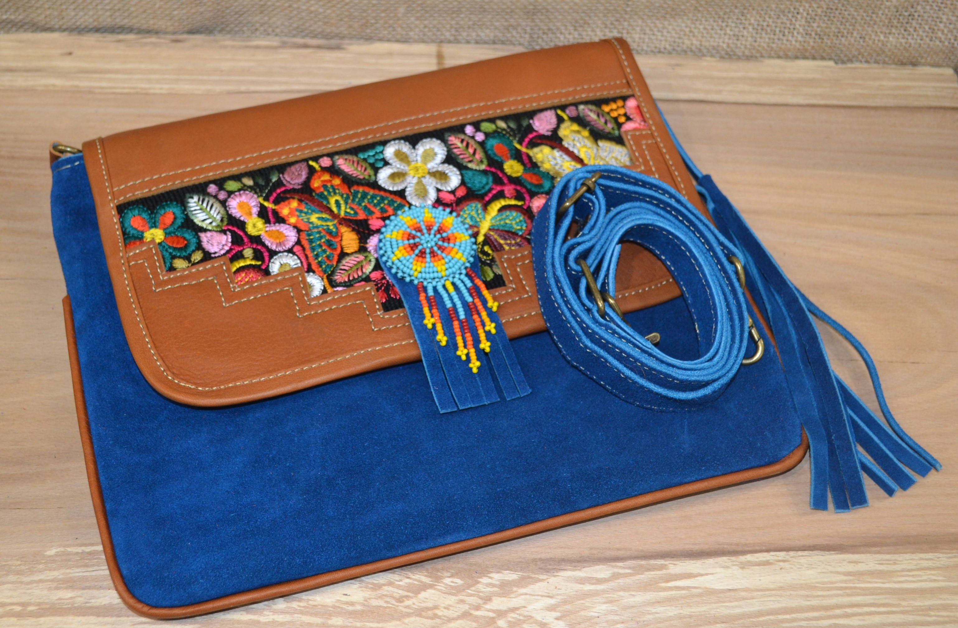 Torebka wykonana ze 100% skóry bydlęcej w kolorze niebieskim w połączeniu z tkaniną pokrytą kolorowymi etnicznymi symbolami to doskonale skomponowany produkt który zachwyca swoją niepowtarzalnością i unikalnością .