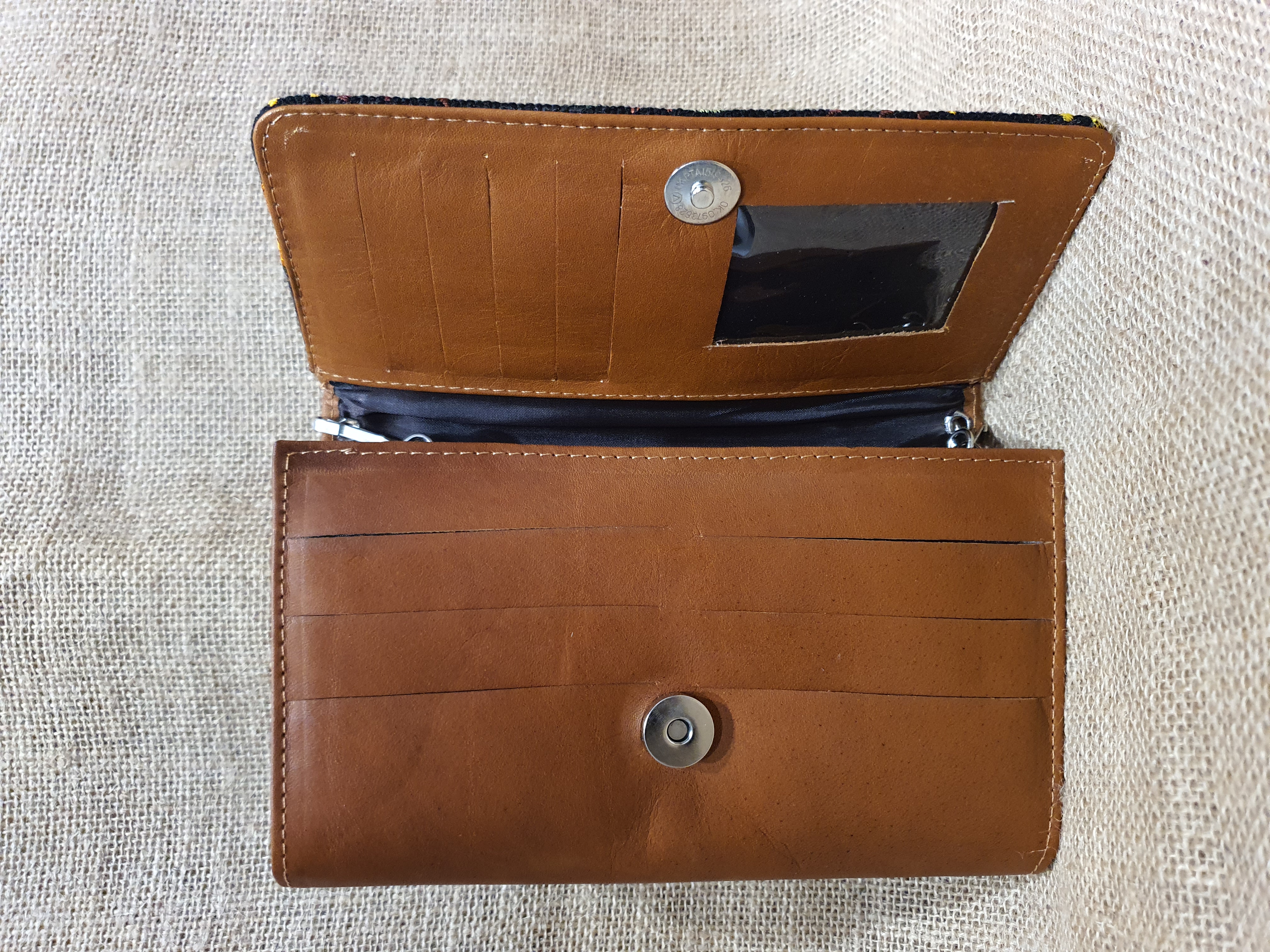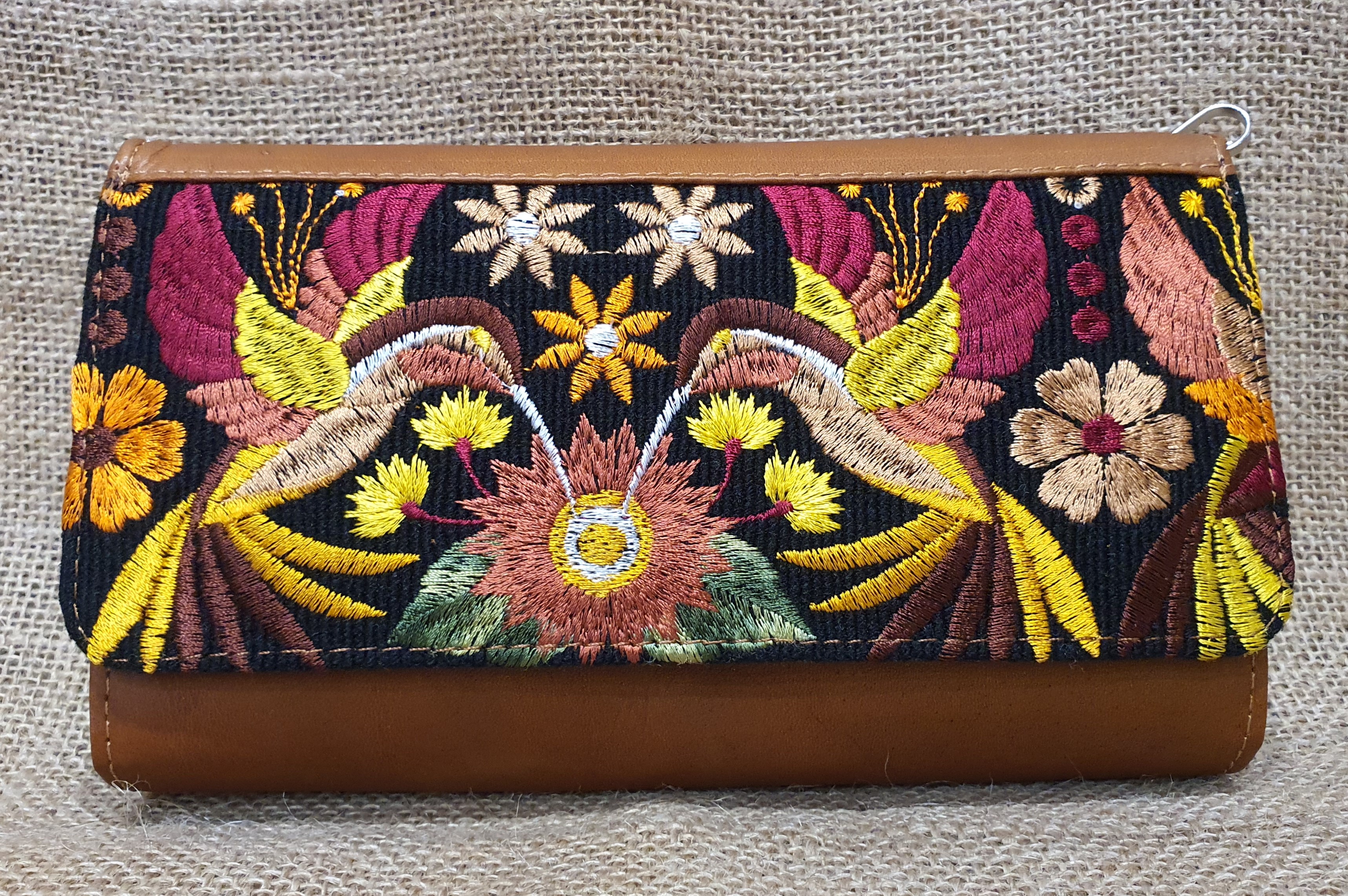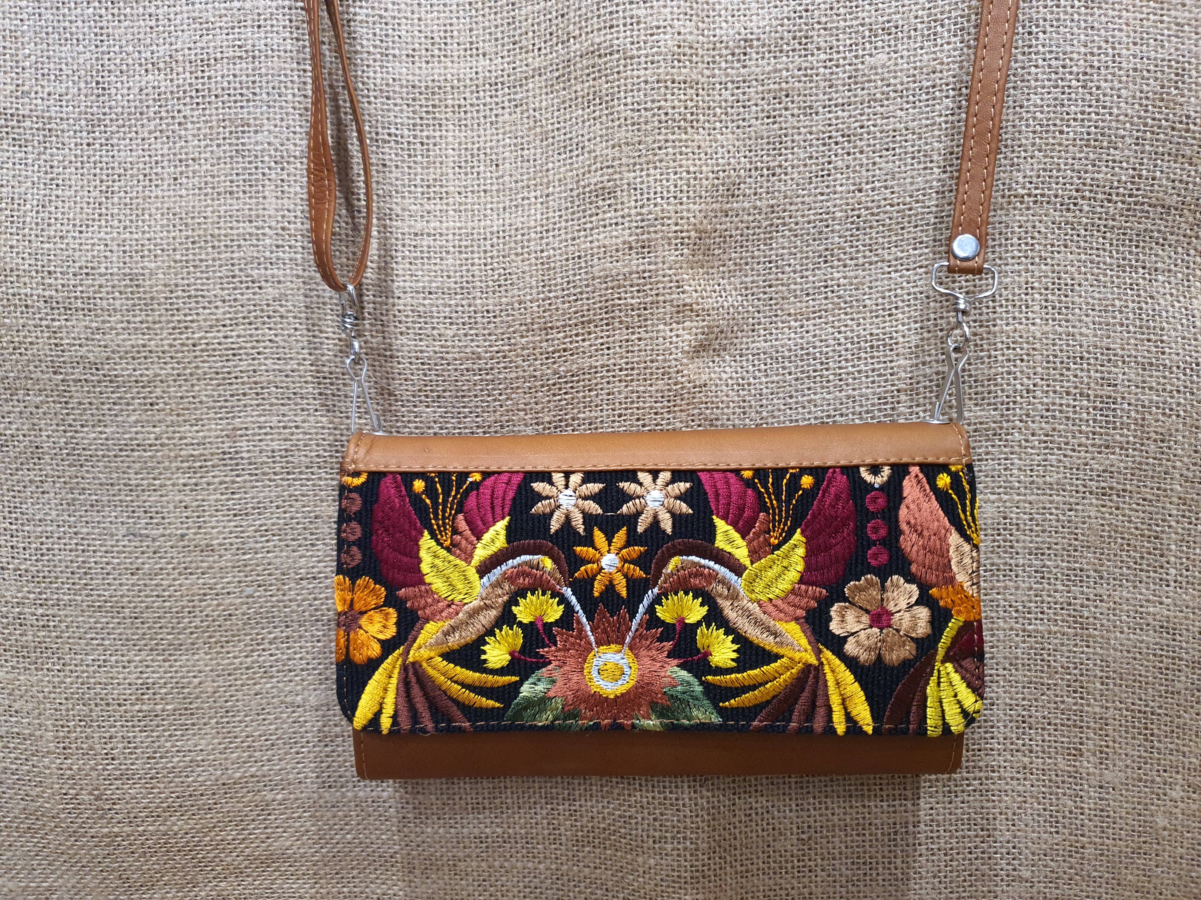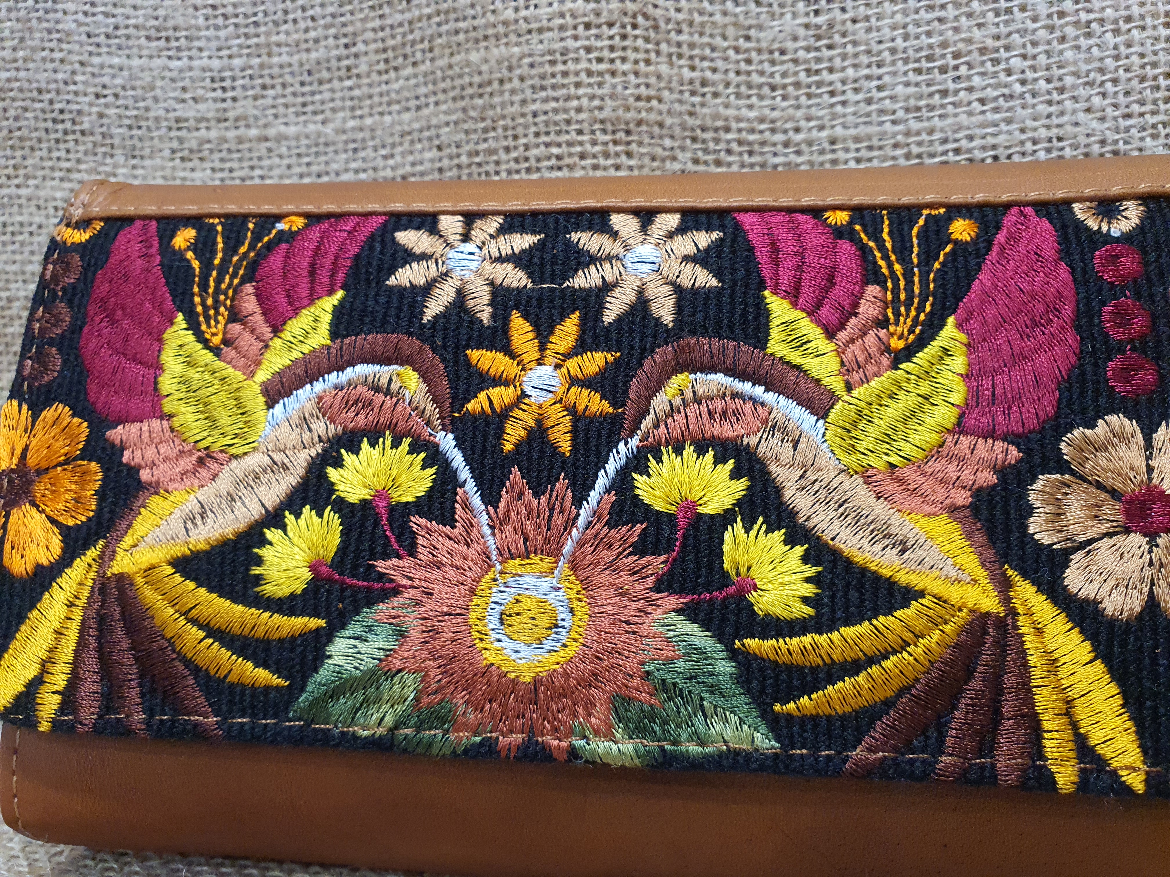 Mała prosta torebka na ramię . Bardzo delikatna i poręczna. Uszyta w Ekwadorskich Andach z naturalnej 100% skóry w kolorze jasnobrązowym . Pokryta kwiatowym lokalnym haftem w odcieniu brązu , czerwieni i żółtego koloru. Wnętrze torebki skrywa trzy przegrody jedna z nich zamykana jest na zamek. Dodatkowo posiada kieszonki na karty płatnicze i dokumenty całość zamykana na zatrzask magnetyczny .