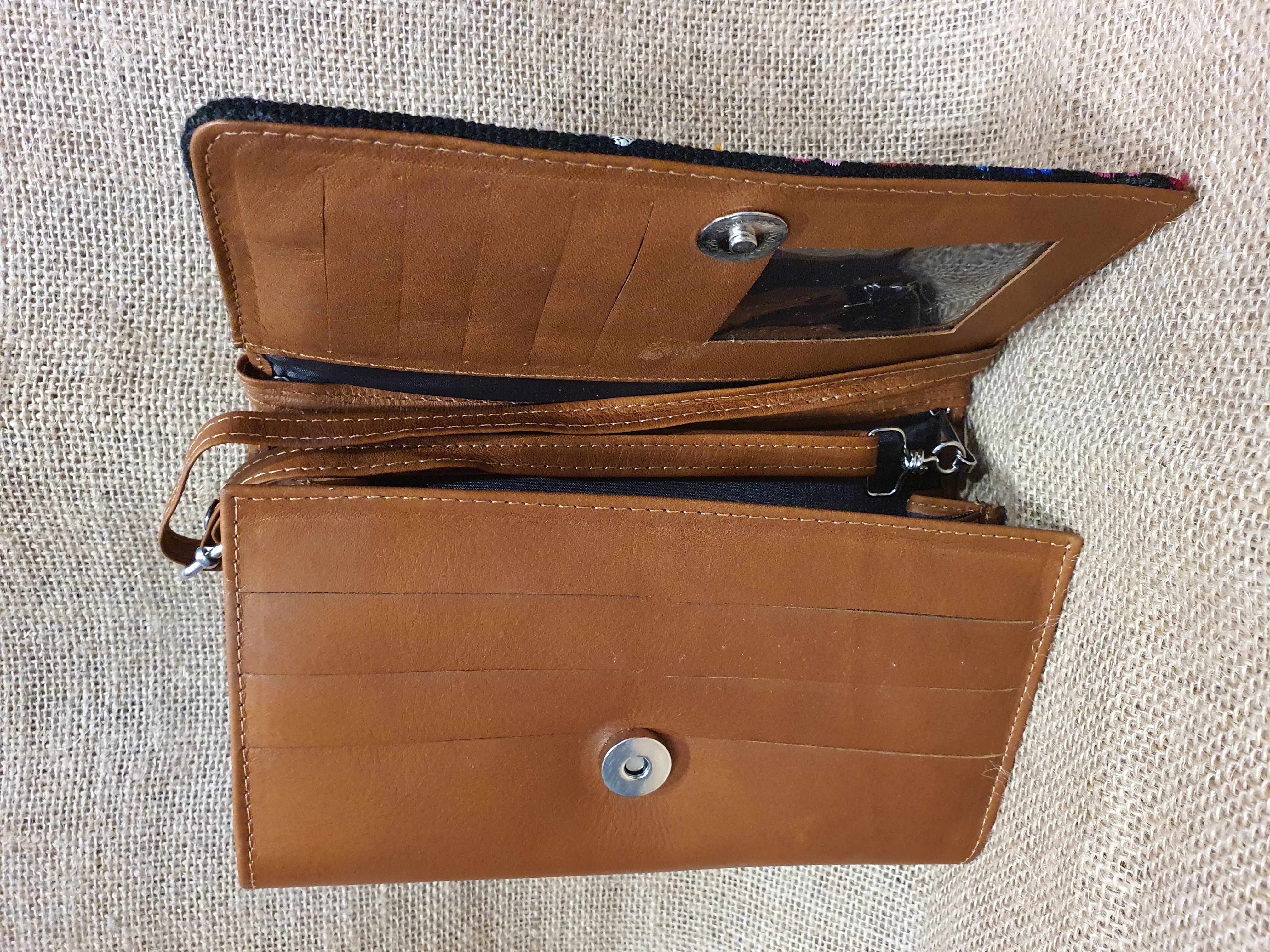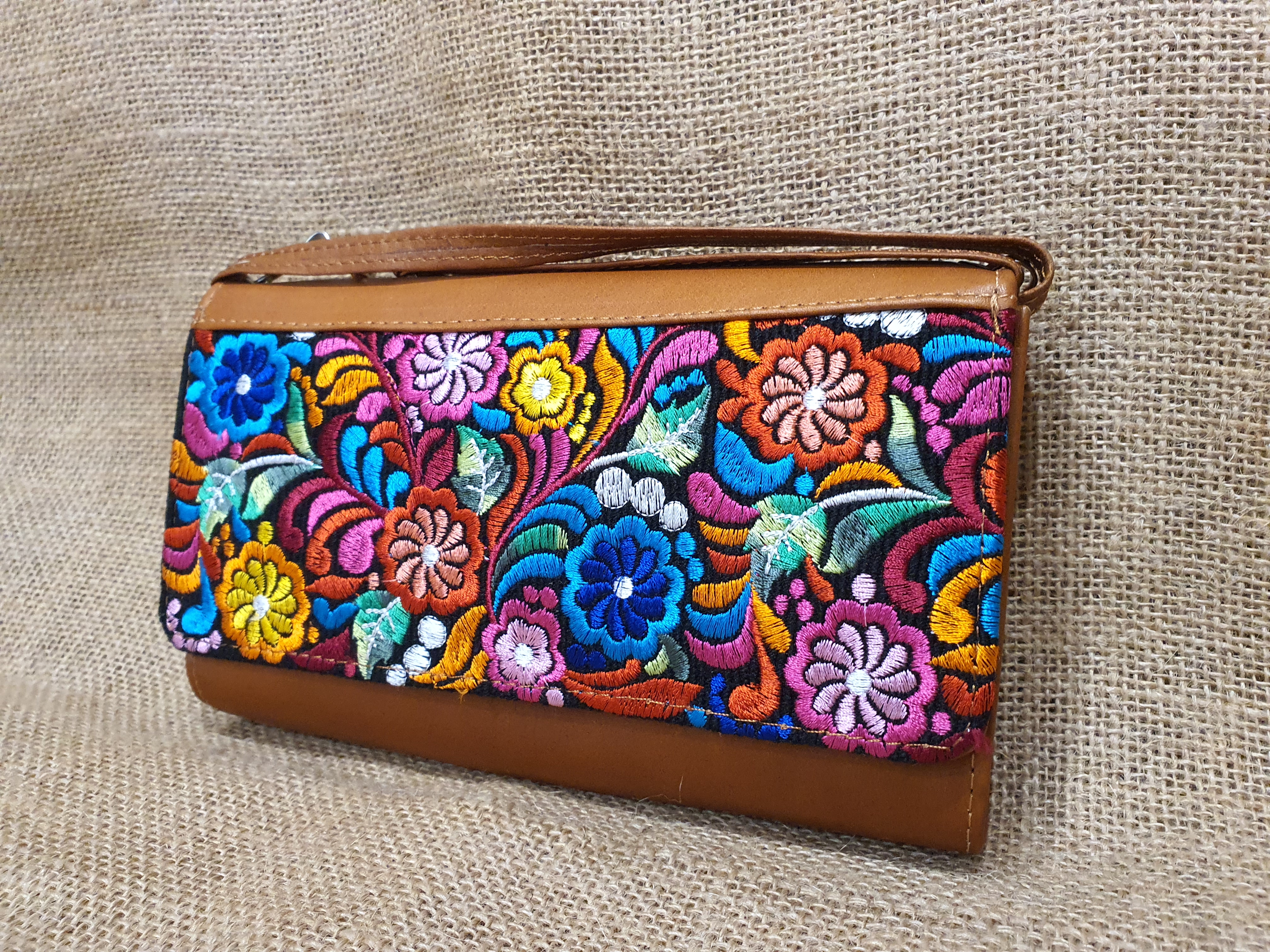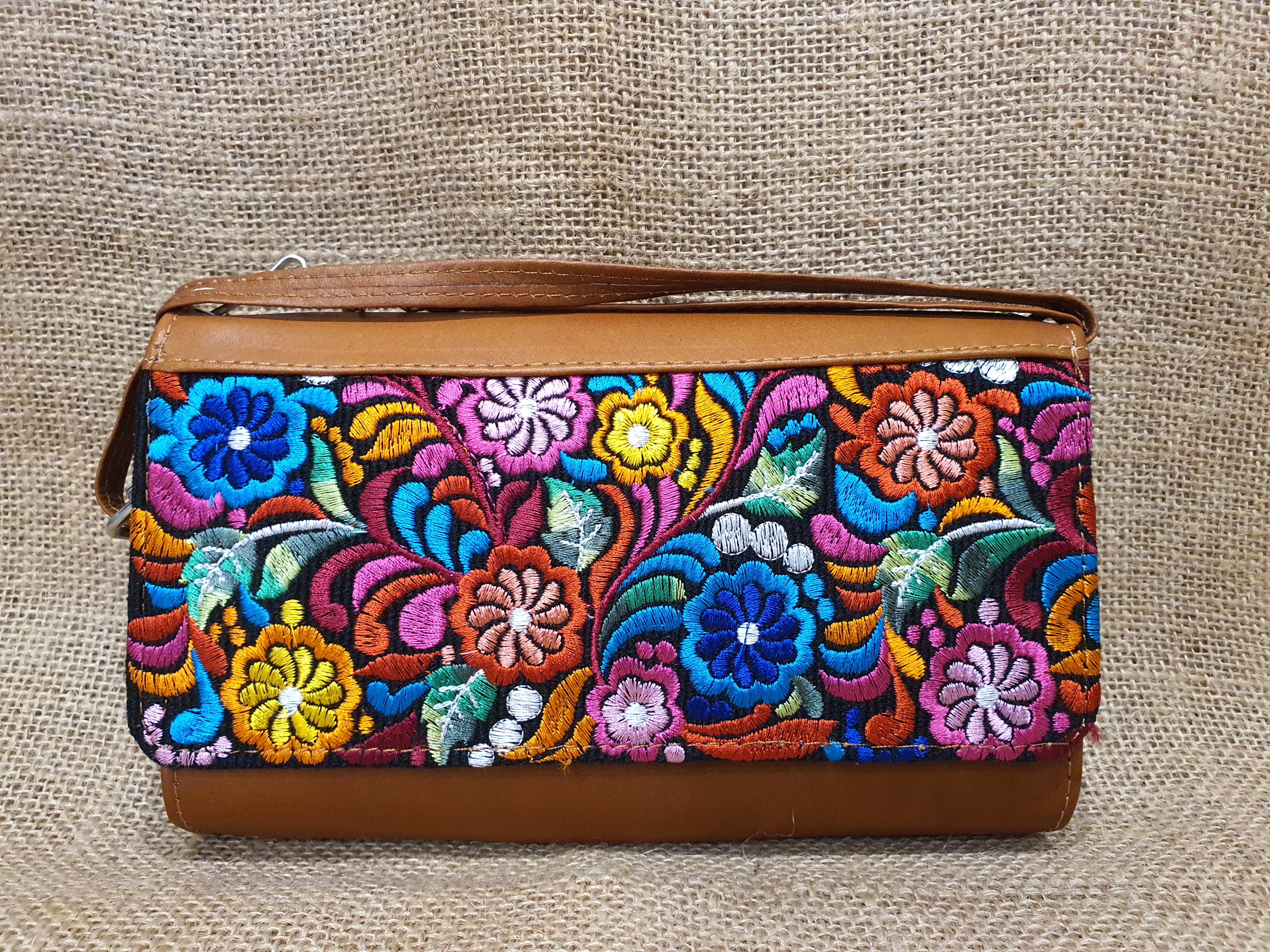 Mała prosta torebka na ramię . Bardzo delikatna i poręczna. Uszyta w Ekwadorskich Andach z naturalnej 100% skóry w kolorze jasnobrązowym . Pokryta kwiatowym lokalnym haftem w odcieniu brązu , czerwieni i żółtego koloru. Wnętrze torebki skrywa trzy przegrody jedna z nich zamykana jest na zamek. Dodatkowo posiada kieszonki na karty płatnicze i dokumenty całość zamykana na zatrzask magnetyczny .